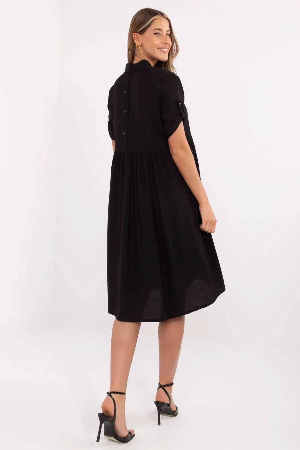 Rozkloszované košilové šaty midi délky, vytvořené s ohledem na každodenní pohodlí a styl. Vyrobené z lehké směsi viskózy a nylonu, poskytují prodyšnost a jemný lesk. Hladká látka zdůrazňuje její univerzální charakter, ideální jak do práce, tak na volnější setkání. Šaty mají klasický límec, krátké rukávy a zapínání na knoflíky. Dekorativní záhyby dodávají ženský šarm a praktická kapsa na prsou prolomuje jednoduchý tvar. Skvělý návrh na každou příležitost, kdy chcete vypadat uvolněně a zároveň elegantně.