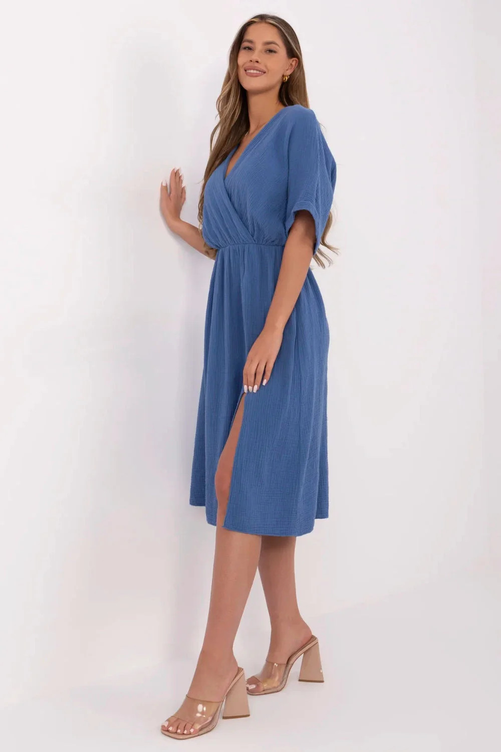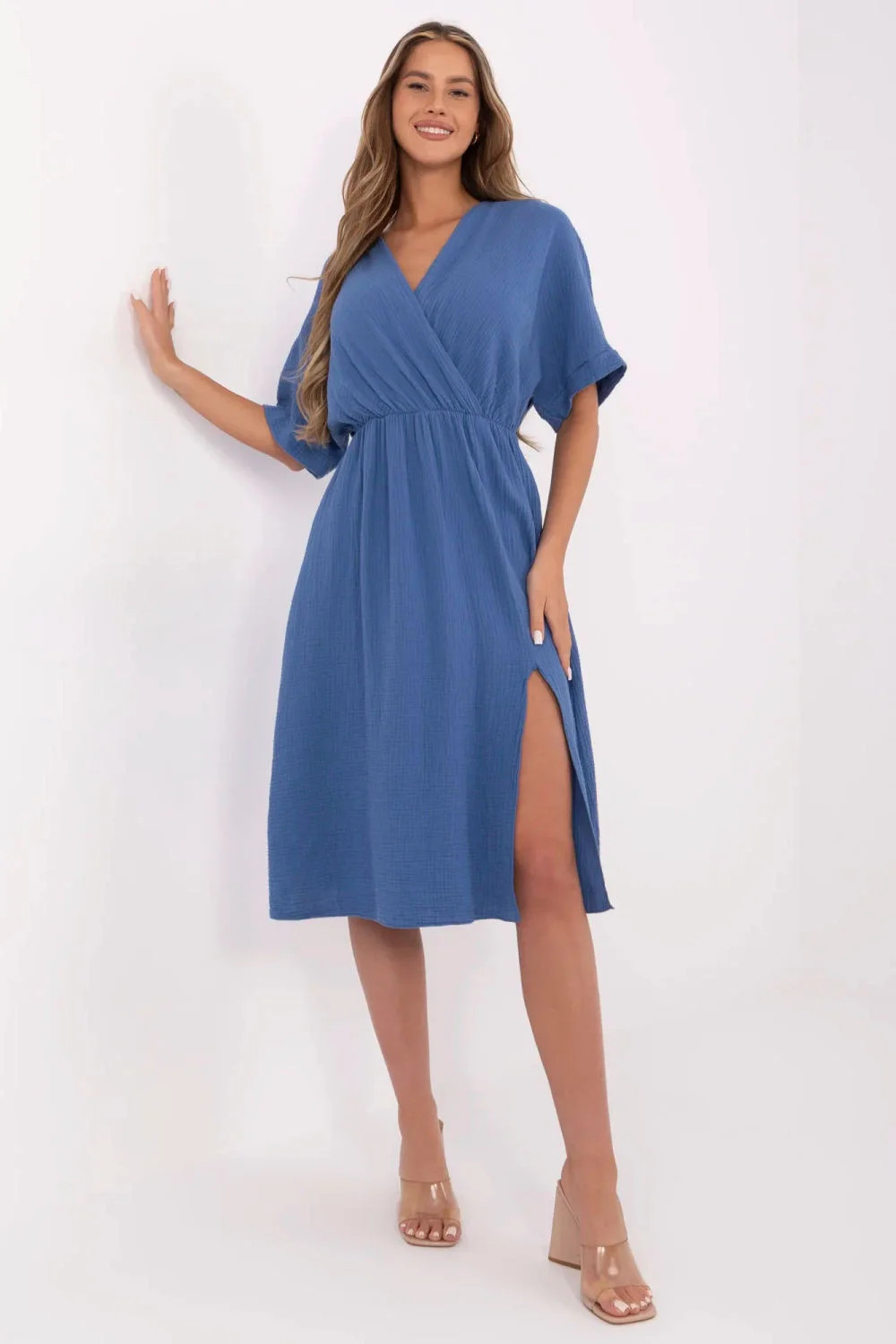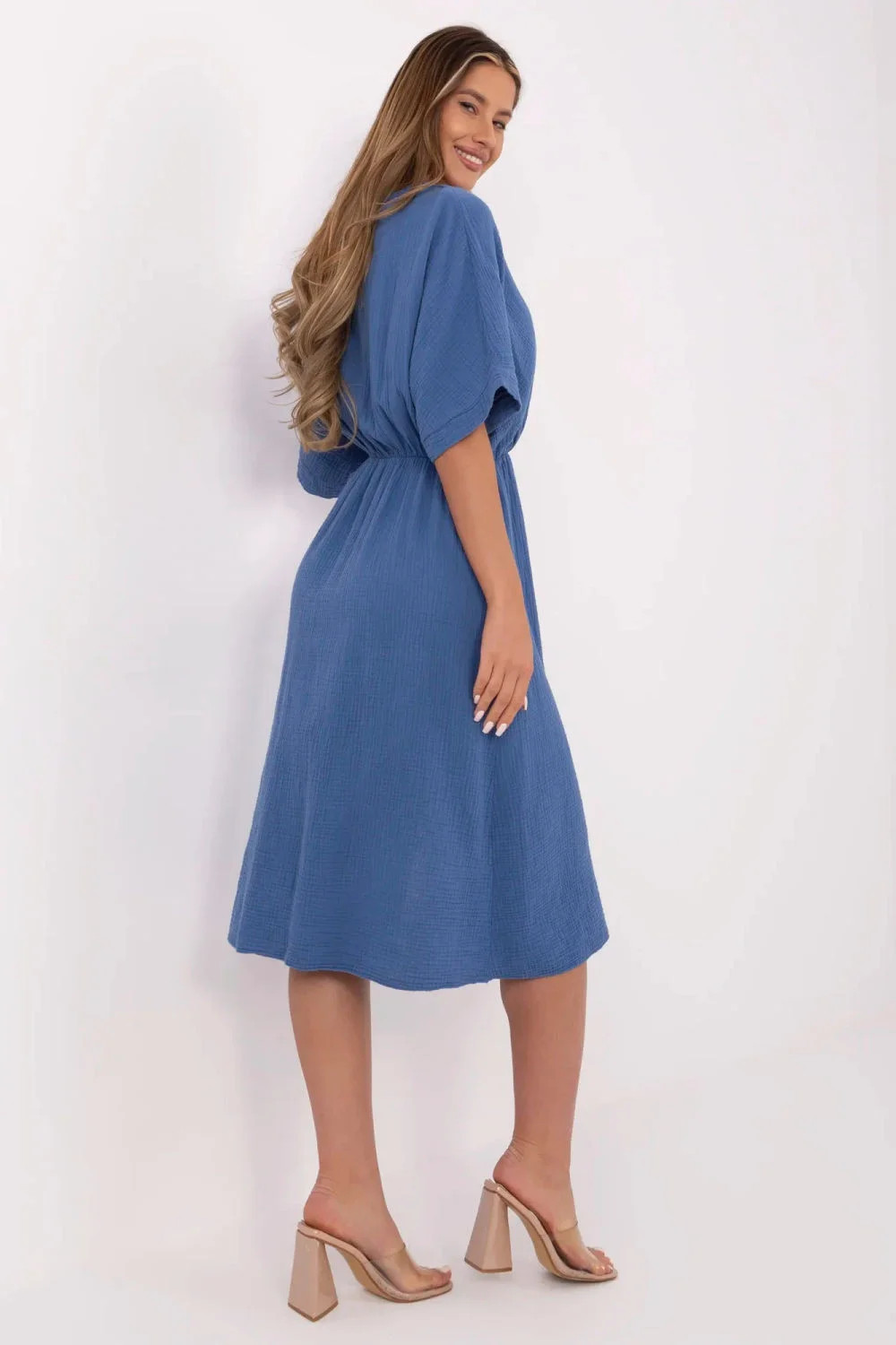 Letní šaty z prodyšného mušelínu jsou must-have v každodenní garderobě. Vyrobena z 100% bavlny, poskytuje výjimečný komfort a prodyšnost i v horkých dnech. Rozkročený střih s překrytým předním dílem krásně zdůrazňuje postavu, a elastický pásek v pasu zajistí ideální přizpůsobení bez nutnosti zapínání. Hladká látka, midi délka a krátký rukáv dělají šaty univerzálními, skvělé jak na procházku, tak na volné setkání. Přirozená lehkost, pohodlí a nadčasový styl.