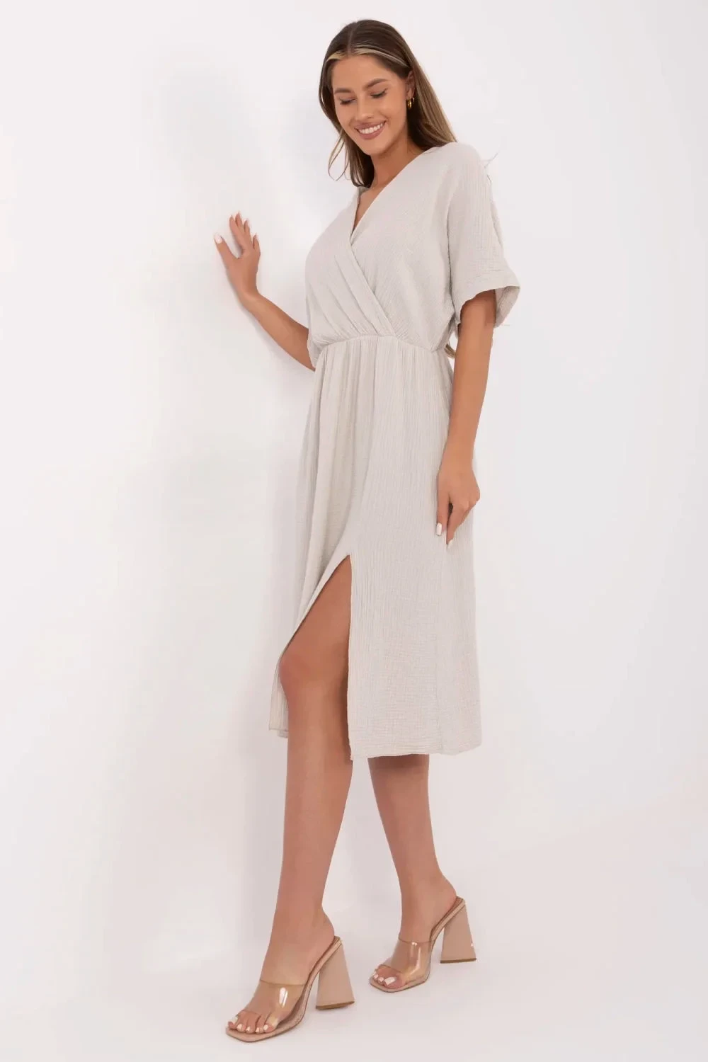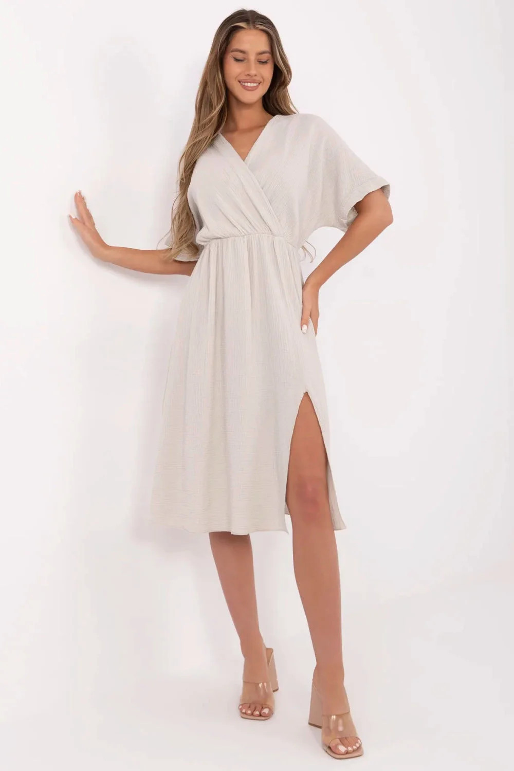 Letní šaty z prodyšného mušelínu jsou must-have v každodenní garderobě. Vyrobené z 100% bavlny poskytují výjimečný komfort a prodyšnost dokonce i v horkých dnech. Rozkročený střih s předním záhybem krásně zdůrazňuje postavu, a elastický pás v pasu zajistí ideální přizpůsobení bez nutnosti zapínání. Hladká látka, midi délka a krátký rukáv dělají šaty univerzálními, skvělé jak na procházku, tak na volné setkání. Přírodní lehkost, pohodlí a nadčasový styl.