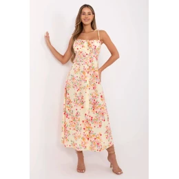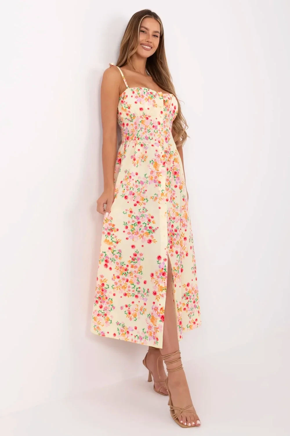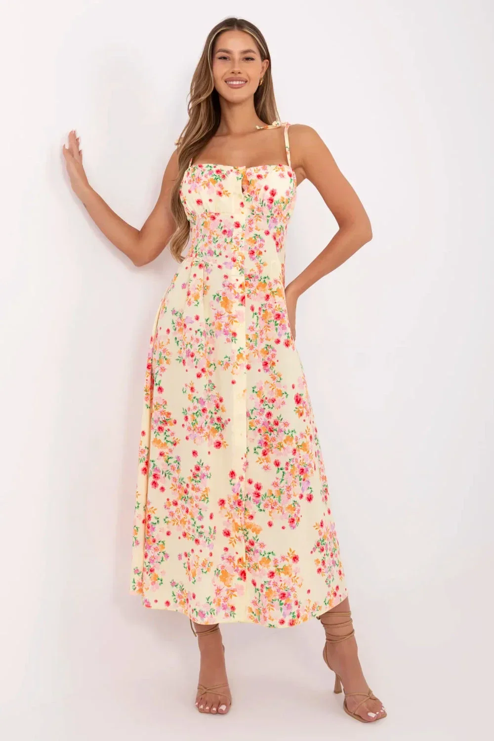 Elegantní a pohodlné šaty na každý den s ženským, rozkročeným střihem. Midi model s obdélníkovým výstřihem a vázanými ramínky, které umožňují perfektní přizpůsobení délky a zajišťují pohodlí nošení. Korzetový pas krásně zdůrazňuje postavu a vestavěné vyztužené košíčky poskytují dodatečnou podporu poprsí, díky čemuž je možné nosit šaty bez podprsenky. Na zádech jsou záhyby, které nejen dodávají šatům šarm, ale také zvyšují elasticitu a pohodlí nošení. Zapínání na knoflíky vpředu jí dodává dívčího charakteru a usnadňuje oblékání. Trendový květinový vzor přitahuje pozornost a zapadá do nejnovějších trendů. Vyrobeno z prodyšného materiálu, směsi polyesteru a elastanu, který zajišťuje volnost pohybu a perfektní přizpůsobení tělu. Skvělý návrh na každodenní vycházky, setkání s přáteli nebo volné letní procházky, vždy, když chcete vypadat stylově, ale cítit se volně.