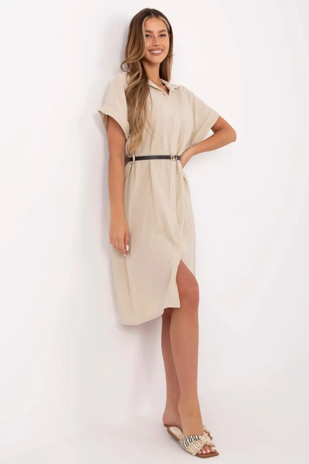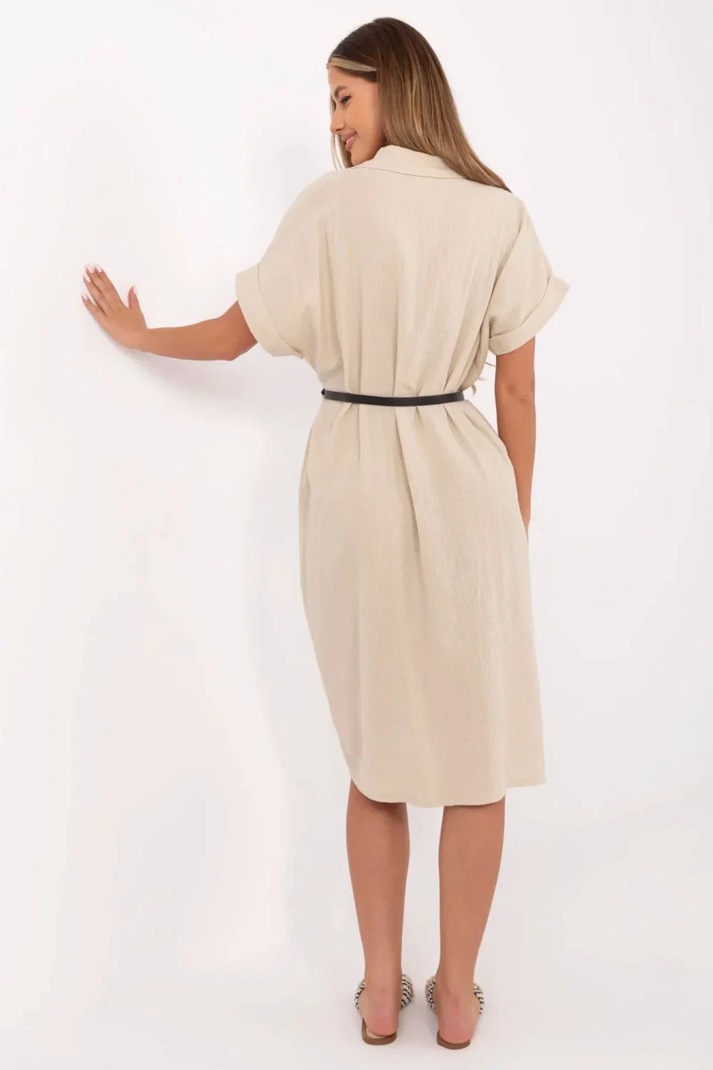 Klasické mušelínové šaty s jednoduchým střihem jsou ideální volbou na každý den do práce. Vyrobené z prodyšné 100% bavlny zajišťují pohodlí po celý den, dokonce i v teplejších dnech. Hladká látka a decentní design dělají šaty skvělým doplňkem minimalistického, ale elegantního stylu. Model s krátkým rukávem, klasickým límečkem a knoflíkovým zapínáním po celé délce. V pasu je zapínací pás, který zdůrazňuje siluetu a umožňuje upravit střih podle vlastních preferencí. Délka po kolena dělá z těchto šatů univerzální volbu do kanceláře, na schůzky nebo každodenní vycházky. Jedná se o nadčasový návrh pro ženy, které oceňují jednoduchost, pohodlí a přírodní materiály ve stylovém provedení.