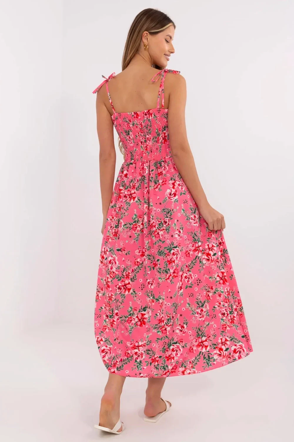 Elegantní a pohodlné šaty na každý den s ženským, rozkročeným střihem. Model midi s obdélníkovým výstřihem a vázanými ramínky, které umožňují perfektní přizpůsobení délky a zajišťují pohodlí při nošení. Korzetový pas krásně zdůrazňuje siluetu a vestavěné tuhé košíčky poskytují další podporu prsou, díky čemuž je možné nosit šaty bez podprsenky. Na zádech jsou zástřihy, které nejen dodávají šatům šarm, ale také zvyšují elasticitu a pohodlí při nošení. Zapínání na knoflíky po celé délce vpředu dodává šatům dívčí charakter a usnadňuje oblékání. Moderní květinový vzor dělá šaty nápadnými a zapadá do nejnovějších trendů. Vyrobeno z prodyšného materiálu, směsi polyesteru a elastanu, který poskytuje volnost pohybu a ideální přizpůsobení tělu. Skvělý návrh na každodenní vycházky, setkání s přáteli nebo volné letní procházky, vždy, když chcete vypadat stylově, ale cítit se volně.