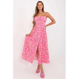 Elegantní a pohodlné šaty na každý den s ženským rozkročeným střihem. Midi model s obdélníkovým výstřihem a vázanými ramínky, které umožňují perfektní přizpůsobení délky a zajišťují pohodlí nošení. Korsážový pas krásně zdůrazňuje siluetu a vestavěné zpevněné košíčky poskytují další podporu prsou, díky čemuž můžete nosit šaty bez podprsenky. Na zádech jsou záhyby, které nejen dodávají šatům kouzlo, ale také zvyšují elasticitu a pohodlí nošení. Zapínání na knoflíky podél přední části jí dodává dívčí charakter a usnadňuje oblékání. Stylový květinový vzor přitahuje pozornost a zapadá do nejnovějších trendů. Vyrobeno z prodyšného materiálu, směsi polyesteru a elastanu, který zajišťuje volnost pohybu a perfektní přizpůsobení tělu. Skvělý návrh na každodenní vycházky, setkání s přáteli nebo volné letní procházky, vždy tehdy, když chcete vypadat stylově, ale cítit se volně.