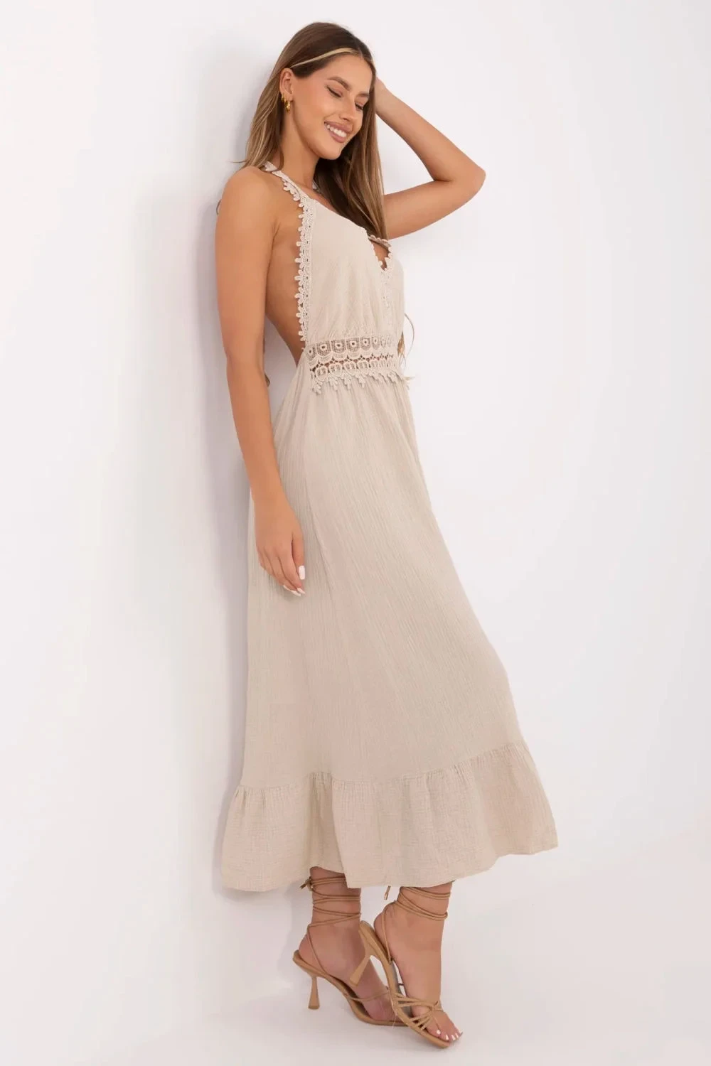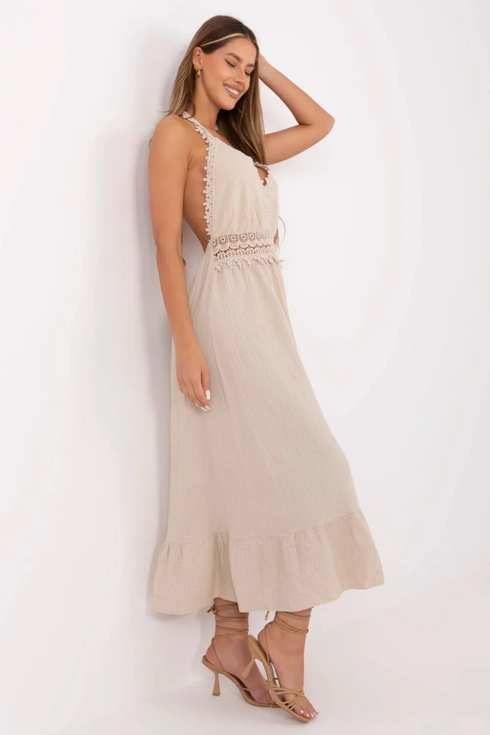 Vložte do svého šatníku trochu letní pohody a ženského šarmu s touto rozkročenou šaty v boho stylu. Vyrobená z prodyšné bavlny s přídavkem elastanu, zaručuje pohodlí a volnost pohybů i v horkých dnech. Midi šaty s vázanými ramínky kolem krku krásně zdůrazňují ramena a záda. Výstřih do podkovy jemně zdůrazňuje ženskou siluetu a ozdobná krajková výšivka na přední straně dodává celku romantický charakter. Hladký materiál a volánky na dně dělají šaty lehké a vzdušné. Ideální volba na každodenní letní příležitosti jako je procházka, pláž nebo setkání s přáteli. Styl boho v nejlepším, ženském provedení. Délka šatů uvedená v tabulce bez vázání. Délka vázání je 72 cm.