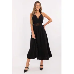 Přidejte do svého šatníku trochu letní pohody a ženského šarmu s touto rozevlátou šaty v boho stylu. Vyrobená z prodyšné bavlny s přídavkem elastanu, zaručuje pohodlí a volnost pohybů i v horkých dnech. Midi šaty s vázanými ramínky kolem krku krásně zdůrazňují ramena a záda. Výstřih do srdíčka jemně podtrhuje ženskou siluetu, a ozdobná krajková výšivka na přední straně dodává celku romantický charakter. Hladký materiál a volán na spodku dělají šaty lehké a vzdušné. To je ideální volba na každodenní letní události, procházku, pláž nebo setkání s přáteli. Boho styl v nejlepším, ženském provedení. Délka šatů je uvedena v tabulce bez vázání. Délka vázání je 72 cm.