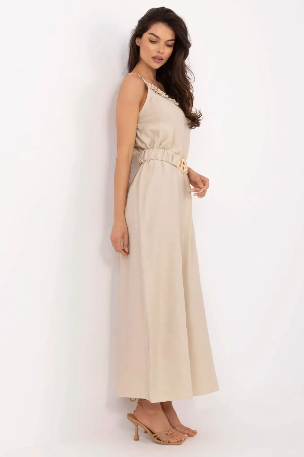 Tato stylová maxi šaty jsou ideálním návrhem na teplé letní dny. Vyrobena z prodyšné viskózy, poskytuje pohodlí nošení a skvěle se hodí do každodenních stylizací. Jednoduchý střih v kombinaci s hladkým, jednolitým materiálem jí dodává elegantní jednoduchost, která se hodí jak na procházku, tak na setkání s přáteli. Šaty mají výstřih do srdce, decentně zdůrazněný ozdobným lemováním, což jim dodává ženský šarm. Na ramínkách, bez zapínání, snadno se oblékají a jsou velmi pohodlné. Přiložený pásek s přezkou umožňuje zdůraznit pas a dodat siluetě požadovaný tvar. Jsou to ideální letní šaty, lehké, stylové a univerzální, s jemnými detaily, které přitahují pozornost, aniž by přehlušily celkový vzhled.