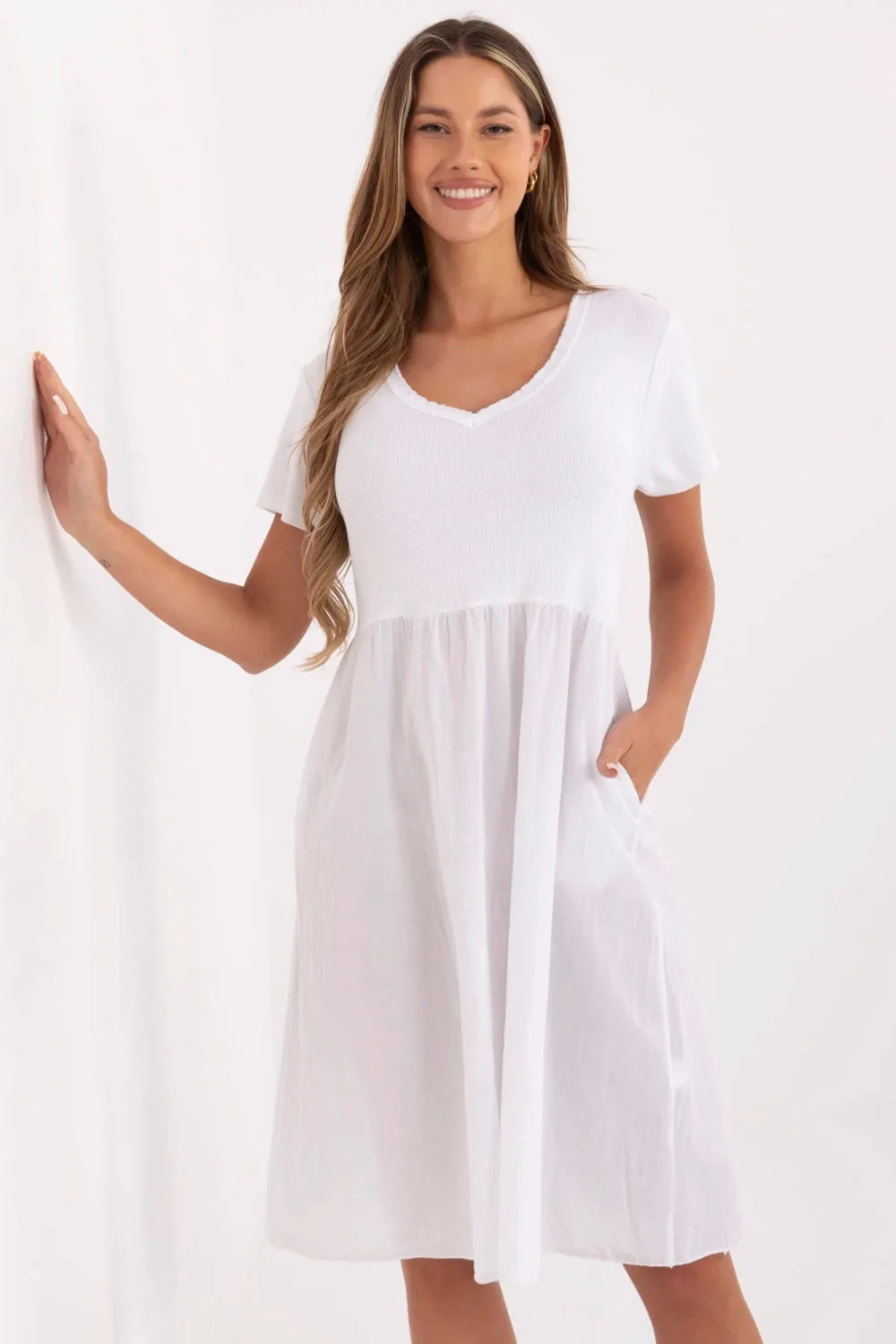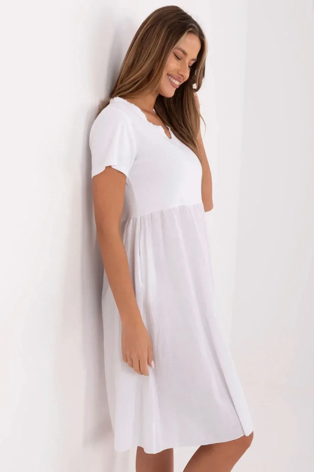 Tato letní, rozklosané šaty jsou ideální volbou pro každodenní stylové a pohodlné oblečení. Jsou vyrobeny z směsi bavlny a elastanu, což zajišťuje prodyšnost a pružnost a skvěle se přizpůsobují postavě. Horní část šatů je vyrobena z pruhované látky, která jemně zdůrazňuje tvary a dodává celku jemnou strukturu. Hladký vzor dává šatům klasický, minimalistický charakter, který lze snadno kombinovat různými způsoby. Model po kolena s krátkým rukávem a výstřihem do šípku krásně zdůrazňuje krk a opticky zúží postavu. Další výhodou jsou praktické kapsy skryté v bočních švech, ideální pro drobné věci nebo pro pohodlí. Jsou to skvělé letní šaty, lehké, pohodlné a stylové, které se hodí jak na procházky, setkání s přáteli, tak i na každodenní nošení.