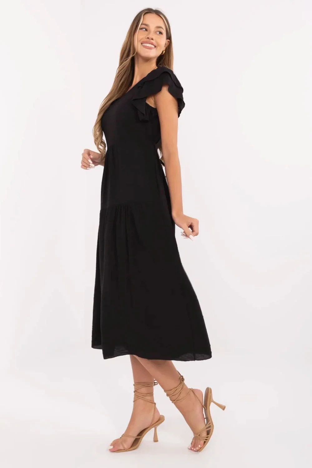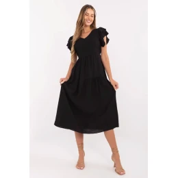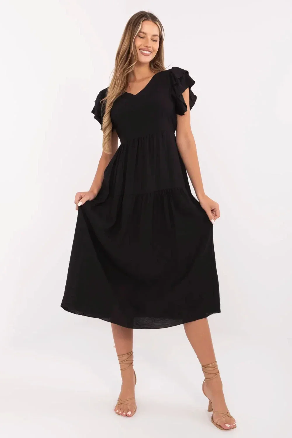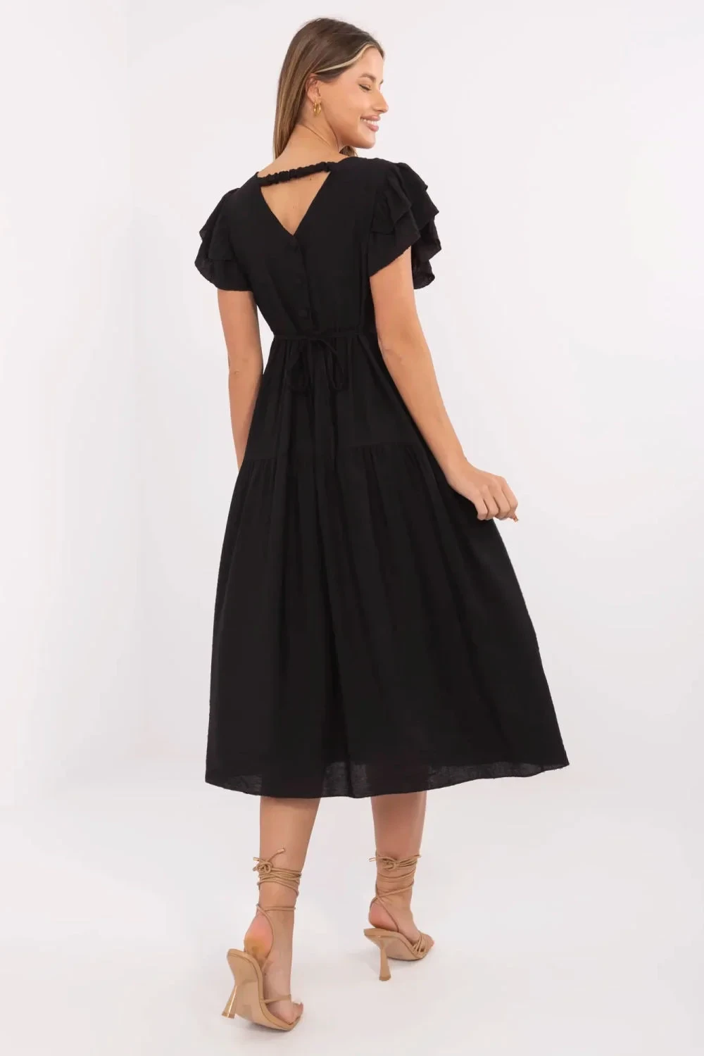 Elegantní a ženské letní šaty s rozkročeným střihem jsou skvělým návrhem na každý den i do práce. Vyrobené z lehké a prodyšné směsi viskózy a nylonu, poskytují pohodlí i v nejteplejší dny. Model midi délky se krásně usazuje na siluetě, a pásek umožňuje jemné zdůraznění pasu. Hladký materiál dodává šatům univerzální elegantní charakter, díky čemuž je snadné je sladit s různými stylizacemi. Krátký rukáv ve formě volánků dodává lehkosti a romantického šarmu, zatímco výstřih ve tvaru srdce opticky zjemňuje krk a dodává ženský šarm. Šaty se zapínají knoflíky na zádech, což je stylový detail a usnadňuje oblékání. Je to ideální návrh pro ženy, které oceňují pohodlí, eleganci a funkčnost, jak při každodenním běhu, tak během klidnějších letních dní.