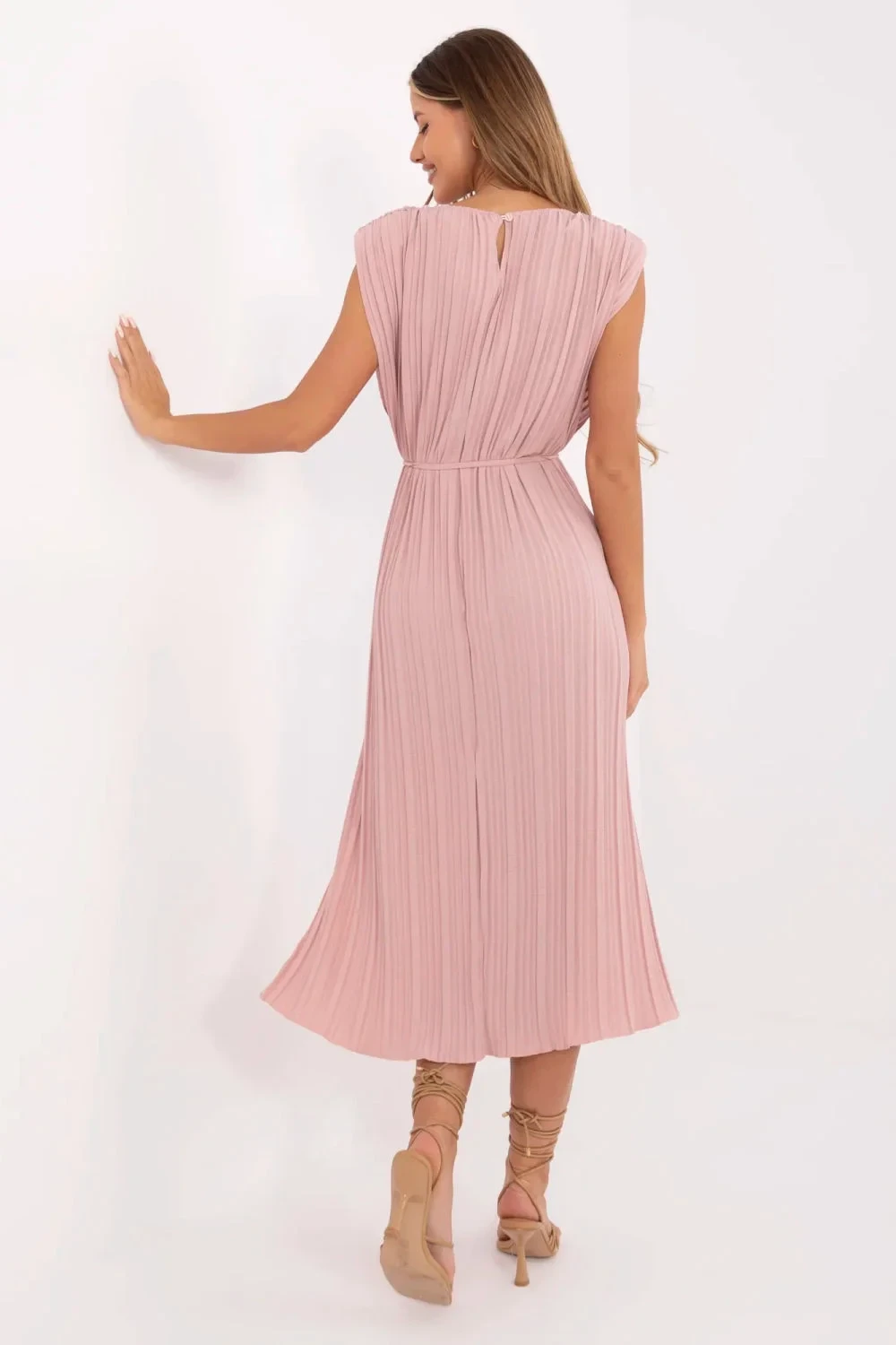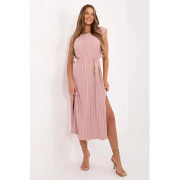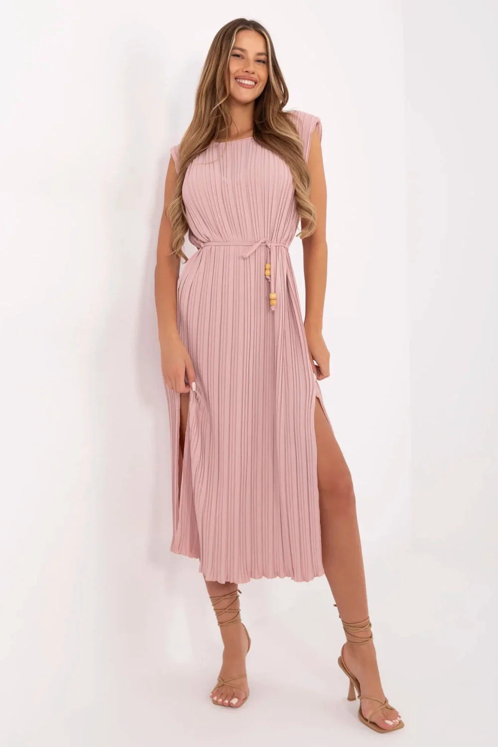 Moderní a stylové letní šaty s rozšířeným střihem jsou skvělou volbou na každodenní příležitosti. Vyrobené z lehké směsi viskózy a polyesteru, okouzlují měkkým, plisovaným materiálem, který se krásně ukládá při pohybu a dodává postavě lehkost. Midi model bez rukávů se skvěle hodí na teplejší dny. Vložené polštářky na ramenou dodávají konstrukci šatů výraz a moderní, lehce drzý charakter, zároveň opticky vyvažují proporce postavy. Kulatý výstřih dodává celku klasického šarmu. Šněrování v pasu umožňuje zdůraznit pas, dodávajíc ženského tvaru, a rozparky po stranách na spodní části šatů přidávají volnost a jemně odhalují nohy během pohybu. Hladký vzor činí šaty univerzálními a snadno stylizovatelnými, ideální jak na procházku, do práce, tak i na nezávazná setkání v letní dny. Materiál je pružný.