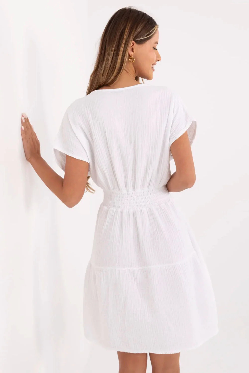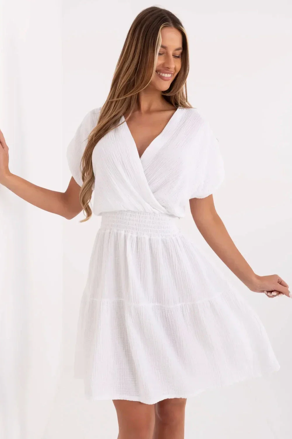 Lehké a vzdušné mušelínové šaty jsou ideální volbou na letní dny. Vyrobené z přírodní bavlny, okouzlují pohodlností nošení a jemností materiálu. Rozkročený střih se krásně usadí během pohybu, dodává postavě lehkost a jemnou eleganci. Model po kolena má krátký rukáv a ženský záhyb, který opticky prodlužuje krk a zdůrazňuje poprsí. Škrticí v pasu jemně zvýrazňují pas, vytvářejí elegantní linii těla a absence zapínání dělá šaty snadno oblékatelné a velmi pohodlné na běžné nošení. Hladký vzor a klasický střih z ní dělají univerzální kus šatníku, ideální na procházku, nákupy nebo setkání s přáteli.