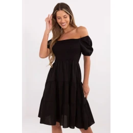 Letní šaty s rozšířeným střihem jsou ideální volbou pro každodenní outfit v teplých dnech. Vyrobené z měkké, prodyšné bavlněné látky s přídavkem elastanu, poskytují pohodlí a volnost pohybu po celý den. Model sahá za koleno a jeho charakteristickými prvky jsou obdélníkový výstřih a nadýchaný krátký rukáv, který dodává celku romantický šarm. Horní část šatů je zdobena záhyby, které zdůrazňují poprsí a dodávají outfitu lehkost. Dalším ozdobným prvkem je volán na spodní části šatů, který krásně vlaje při pohybu. Bez zapínání je model snadno obléknutelný a velmi pohodlný na každodenní nošení. Hladký materiál a ženský střih dělají tyto šaty vhodné jak na procházky, nákupy, tak i na setkání s přáteli.