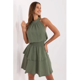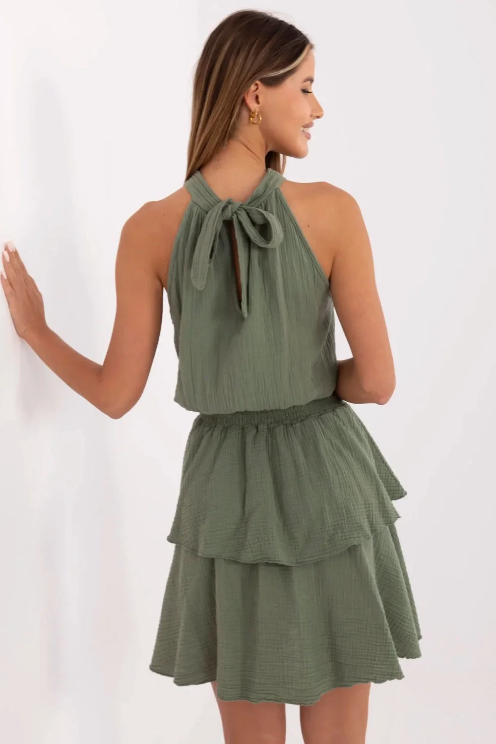 Lehké a vzdušné šaty ideální na letní dny. Vyrobené z prodyšné, příjemné na dotek bavlněné mušelínové látky, která zajistí pohodlí i v největším horku. Model s rozkročeným střihem, s délkou před kolena, krásně zdůrazňuje ženskou siluetu. Stahování v pasu s všitou gumou jemně modeluje pas, a spodní část s volány přidává lehkost a jemný půvab. Šaty mají kulatý výstřih a jsou bez rukávů, což je ideální pro každodenní letní aktivity. Vzadu elegantní vázání na krku zdůrazňuje jemnost zad a dodává celku romantický charakter. Univerzální, hladký vzor dělá z těchto šatů skvělou základnu pro denní styling, stačí přidat žabky, slaměný klobouk a jste připraveni na procházku po pláži nebo oběd s kamarádkou.
