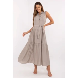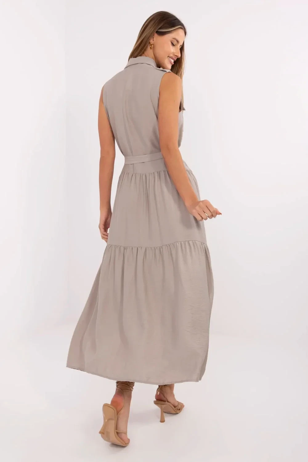Elegantní a pohodlné šaty s rozšířeným střihem, které spojují každodenní volnost s nádechem elegance. Vyrobené z prodyšné směsi viskózy a nylonu, skvěle se hodí jak do práce, tak do běžných situací. Model maxi délky, bez rukávů, s klasickým límečkem a knoflíkovým zapínáním až po pas. V pasu se nachází pásek k zavázání, který jemně zdůrazňuje siluetu a umožňuje přizpůsobit šaty postavě. Dalšímu šarmu dodávají kapsy s patkami v oblasti hrudníku, které přinášejí jemný akcent ve stylu utility, a široký volán dole, který dodává lehkost a ženský charakter. Díky jednoduchému vzoru jsou šaty univerzální základ pro mnoho stylizací, skvěle vypadají jak s sandály, tak s klasickými balerínami nebo espadrilkami.