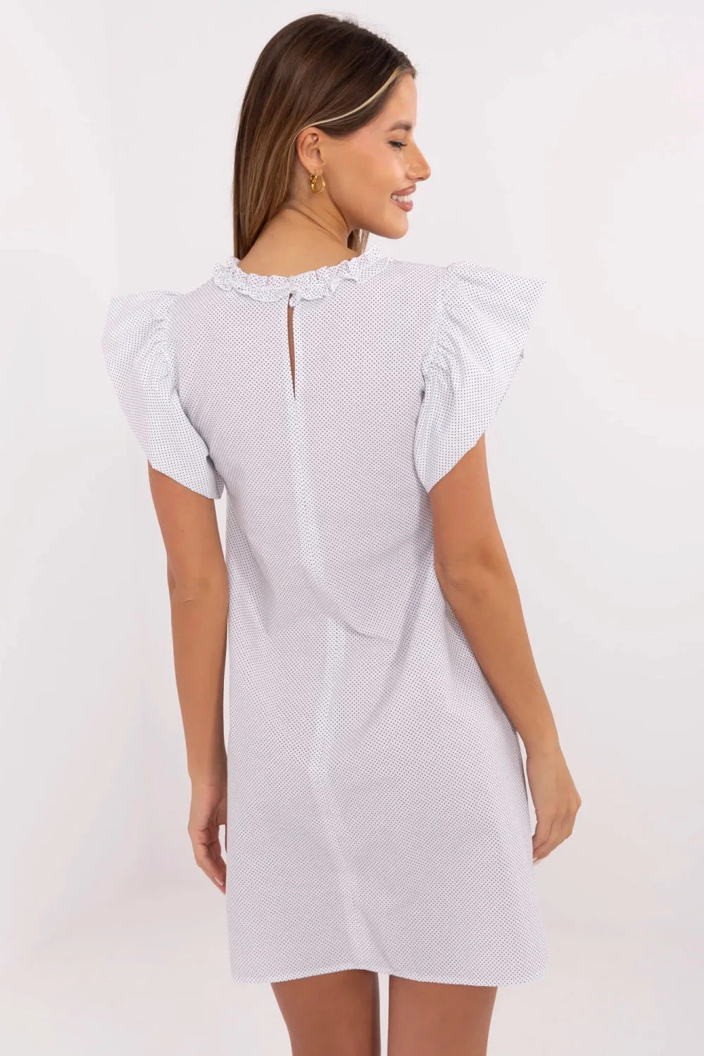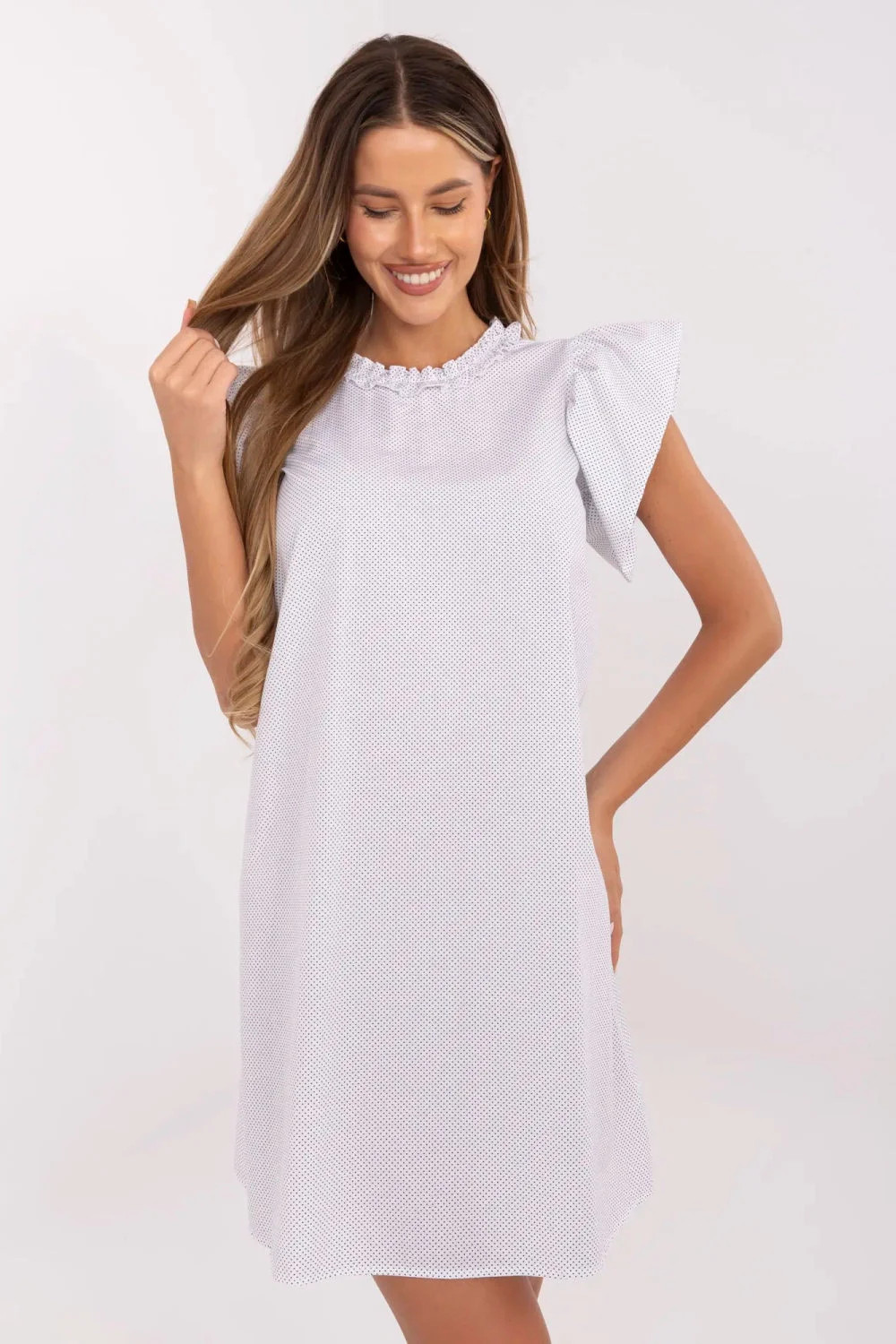 Letní šaty s rozšířeným střihem a drobnými puntíky jsou ženským a stylovým návrhem na teplé dny. Vyrobena z prodyšné bavlny, zaručuje pohodlí nošení a volnost pohybů, skvěle se hodí jak do každodenního stylu, tak i do práce. Model před kolena nádherně padne na postavu, zdůrazňuje pas a dodává lehkost celému outfitu. Krátké rukávy ve formě volánků a kulatý výstřih s decentním volánem přidávají šatě romantický a dívčí půvab. Bez zapínání zajišťuje pohodlí a snadné oblékání. Jemný vzor s drobnými puntíky dodává celku svěžest a nadčasový charakter. Je to skvělá volba na léto, stačí přidat sandály nebo baletky a vytvořit lehký a stylový vzhled.