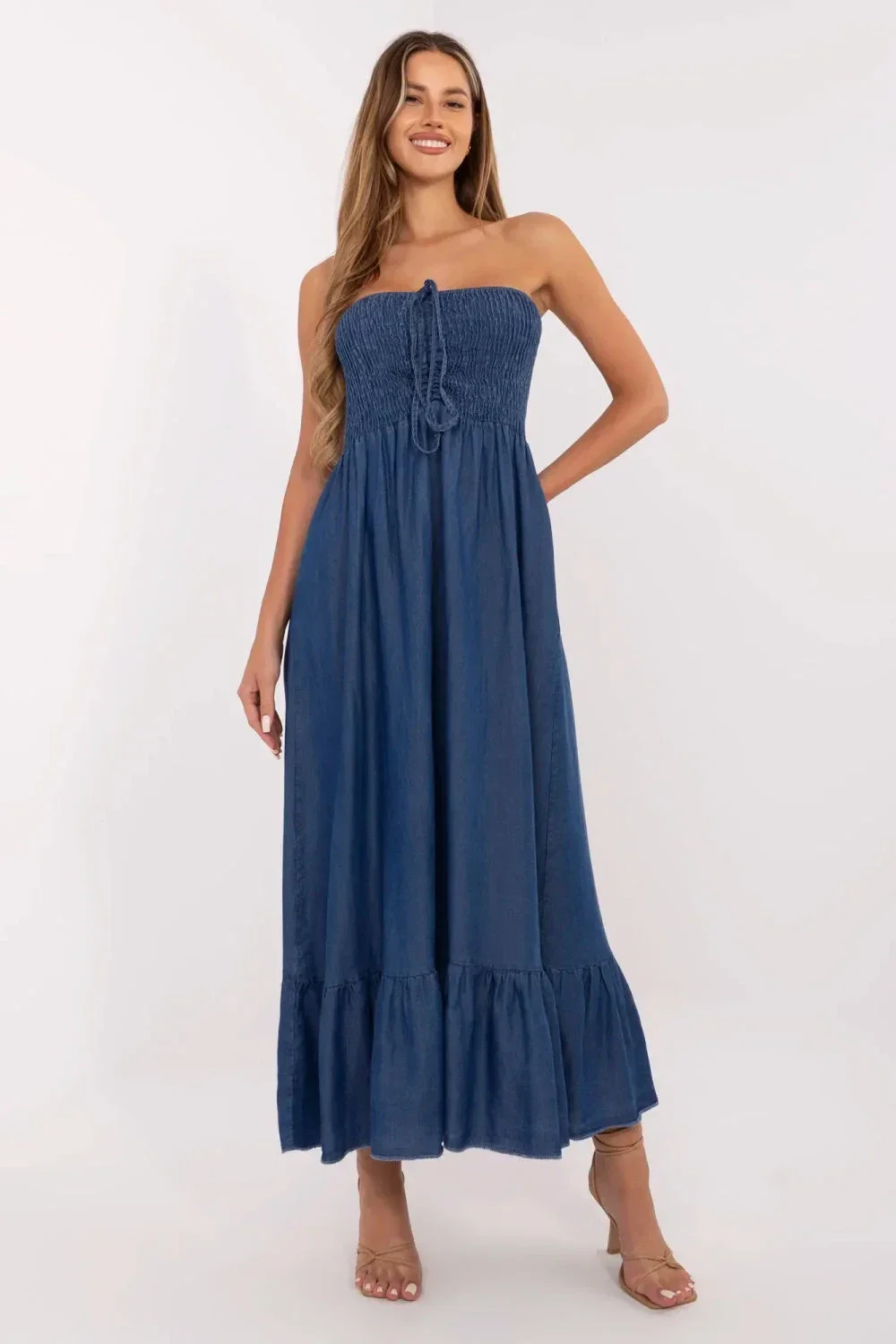 Letní maxi šaty s rozkročeným střihem jsou kvintesencí ženského stylu a pohodlí na teplé dny. Vyrobené z lehkého, prodyšného lyocellu, skvěle se hodí do každodenních outfitů, poskytují pohodlí a prodyšnost. Model bez ramínek s obdélníkovým výstřihem vypadá decentně a moderně. Horní část šatů je zdobena efektním roucháním s elastickými gumičkami, které zajišťují dokonalé přizpůsobení postavě a jemně zdůrazňují poprsí. Rozkošné vázání u výstřihu dodává celku romantický nádech, a volán na spodní části dodává šatům lehkost a nenucenost. Bez zapínání je tento model snadno nasaditelný a velmi pohodlný. Je to ideální letní šaty pro ženy, stylové a univerzální, které se hodí jak k plochým sandálům, tak k espadrilům.