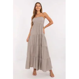 Letní maxi šaty s rozšířeným střihem jsou ideální volbou na teplé každodenní dny. Vyrobeny z přírodní směsi viskózy a lnu, poskytují prodyšnost, lehkost a pohodlí po celý den. Model bez ramínek s obdélníkovým výstřihem vypadá žensky a stylově. Horní část šatů je zdobena elastickými záhyby s gumou, které skvěle padnou k postavě a zdůrazňují linii poprsí. Spodní část je zakončena širokou volánkou, dodávající šatům lehkost a romantický charakter. Bez zapínání je model snadno navléknutelný a pohodlný na nošení. Je to skvělá volba na letní procházky, setkání s přáteli nebo výlety, stačí přidat sandály a košíkovou kabelku pro vytvoření úplně půvabného outfitu.