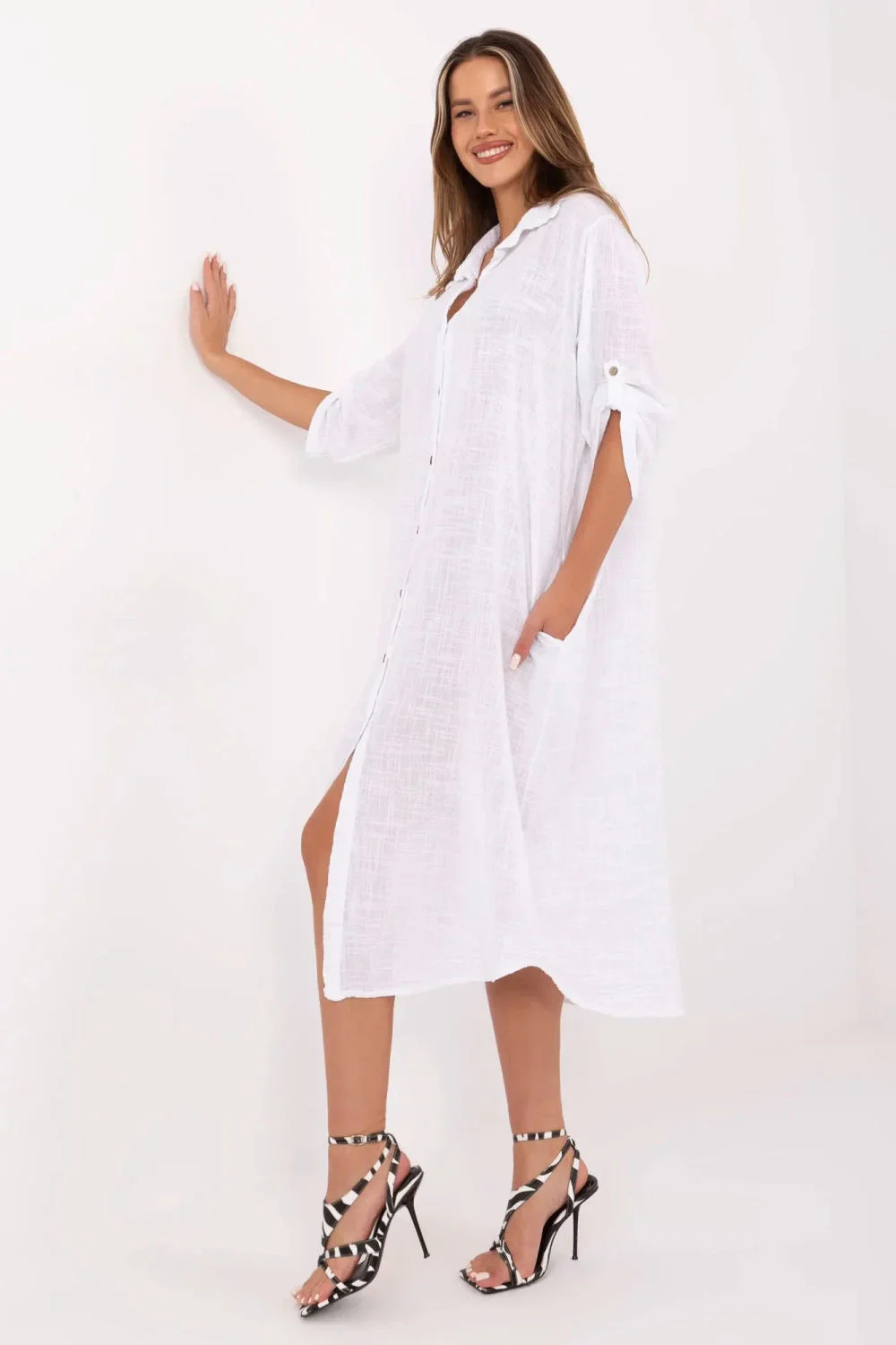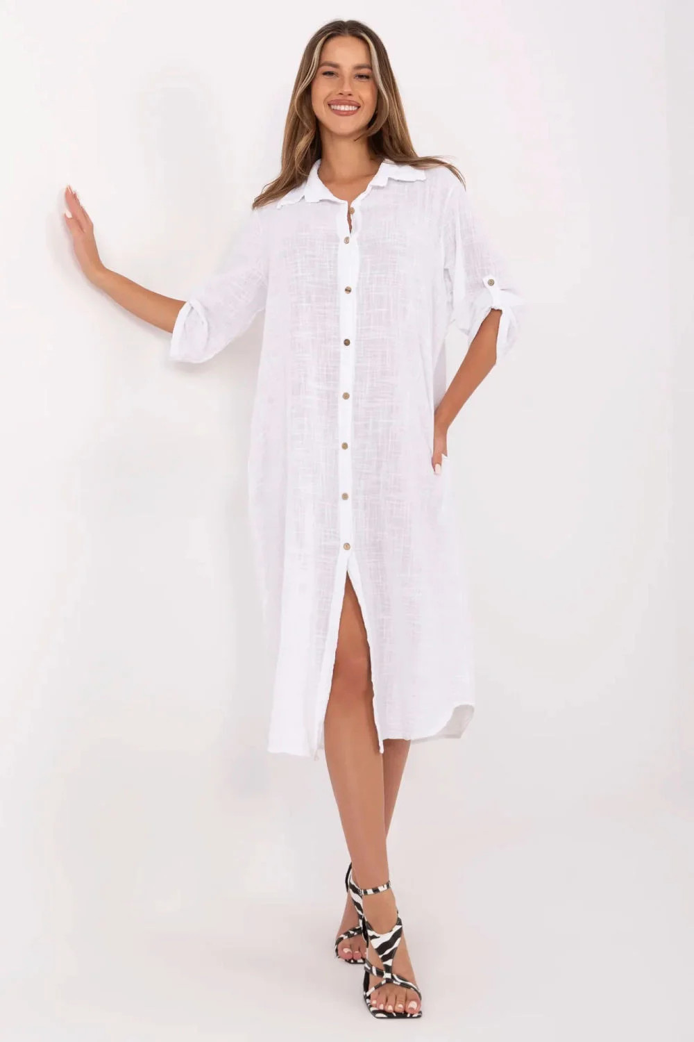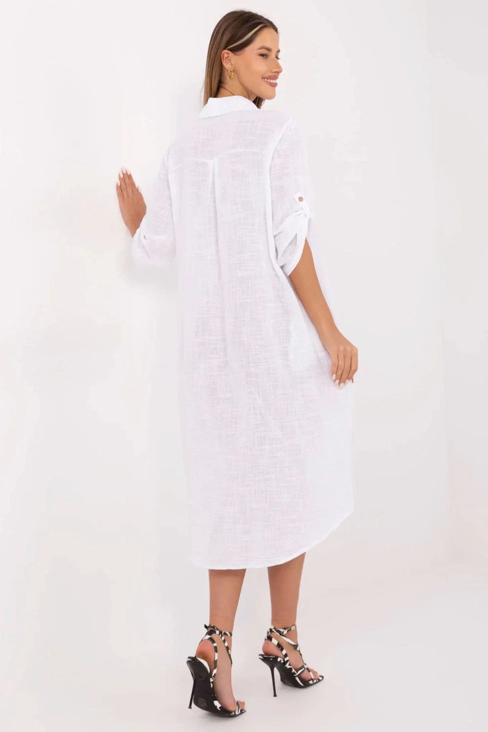 Letní oversized košilové šaty jsou ideální volbou pro každodenní stylizace. Vyrobeny z prodyšné přírodní bavlny poskytují pohodlí i v teplejších dnech. Model midi délky je charakterizován klasickým límečkem a knoflíkovým zapínáním po celé délce. 3/4 rukávy s možností přepnutí zvyšují funkčnost a umožňují přizpůsobit šaty různým teplotám. Hladký materiál a volný střih jí dodávají univerzální charakter, a vsunuté kapsy skryté v bočních švech jsou praktickým detail, který zdůrazňuje každodenní, uvolněný styl těchto šatů.