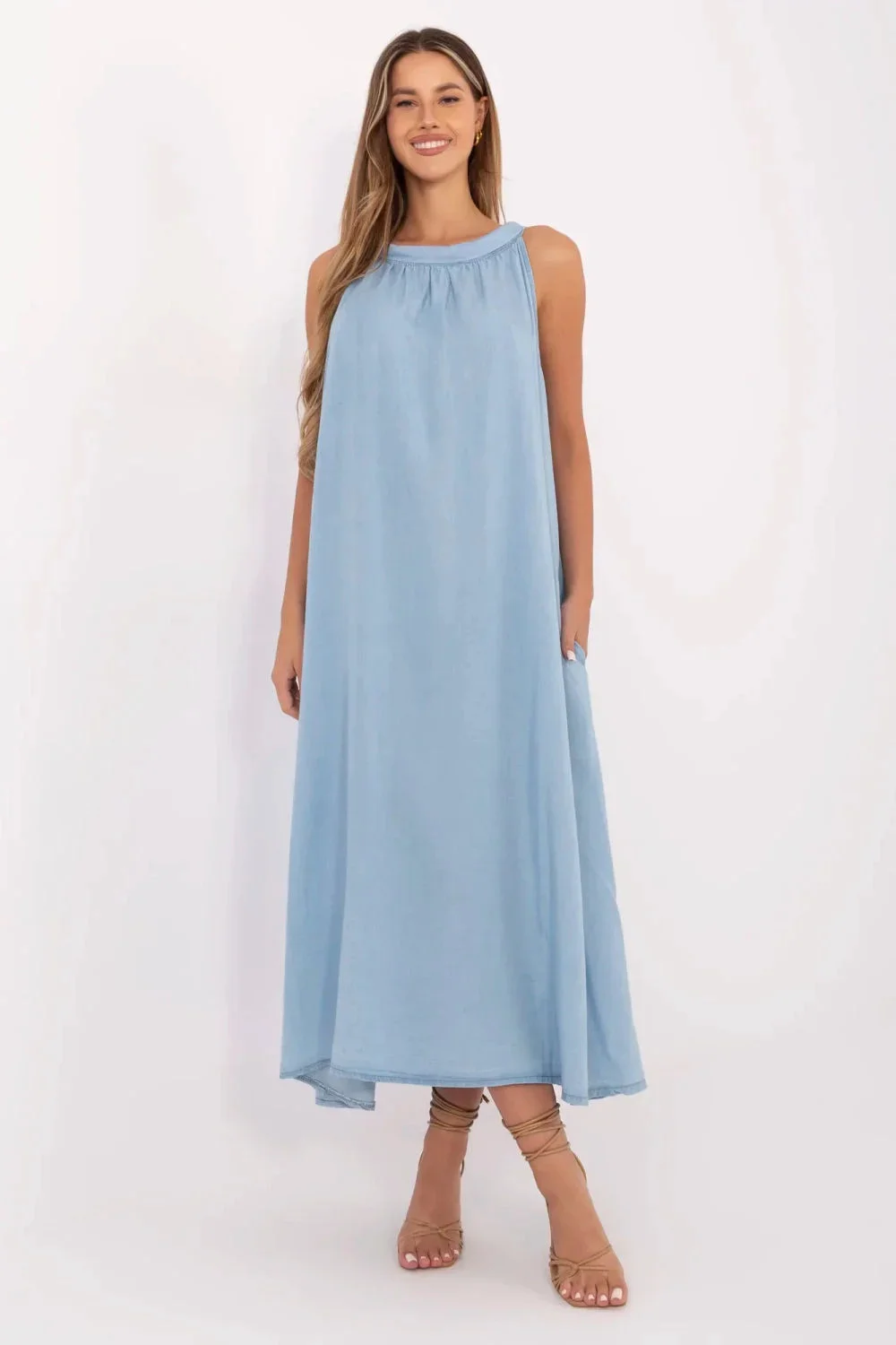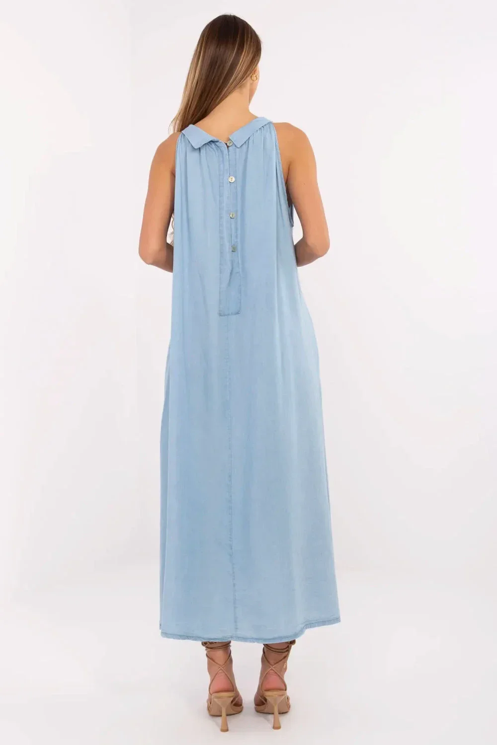 Letní džínové šaty ve stylu oversized jsou spojením pohodlí, lehkosti a ležérního stylu. Vyrobena z měkkého a prodyšného lyocellu, skvěle se hodí na teplé dny. Hladký materiál a volný střih zajistí volnost pohybu, zatímco maxi délka dodá šatům lehkost a jemnou eleganci. Model bez rukávů s klasickým kulatým výstřihem decentně zdůrazní ramena. Praktické kapsy skryté v bočních švech zvyšují funkčnost, zatímco zapínání na knoflíky vzadu dodává šarmu a usnadňuje oblékání. Ideální volba pro každodenní letní outfity.