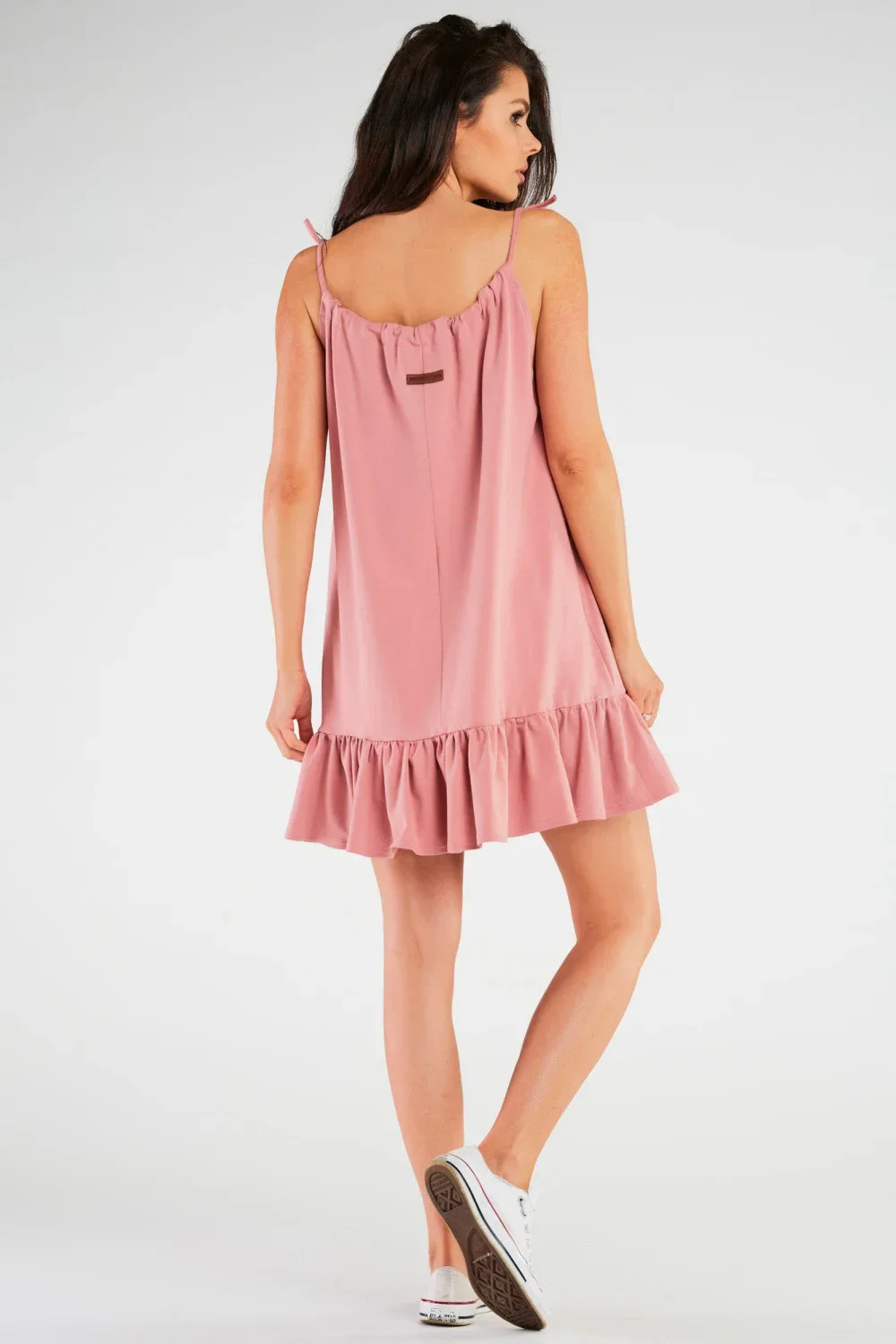 Letní šaty z měkké pleteniny. Model rozšiřovaný ke spodu skrývá drobné nedokonalosti postavy a je skvělou volbou pro těhotné ženy. Šaty jsou dokončeny volánem, který ovlivňuje dívčí charakter celku. Navrženo a ušito v Polsku.