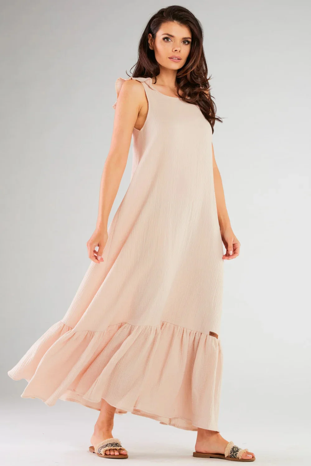 Dlouhé šaty vytvořené pro milovnice romantických a zároveň pohodlných stylizací. Vzor se rozšiřuje směrem dolů, skvěle zakrývá drobné nedostatky těla. Navrženo a ušito v Polsku.