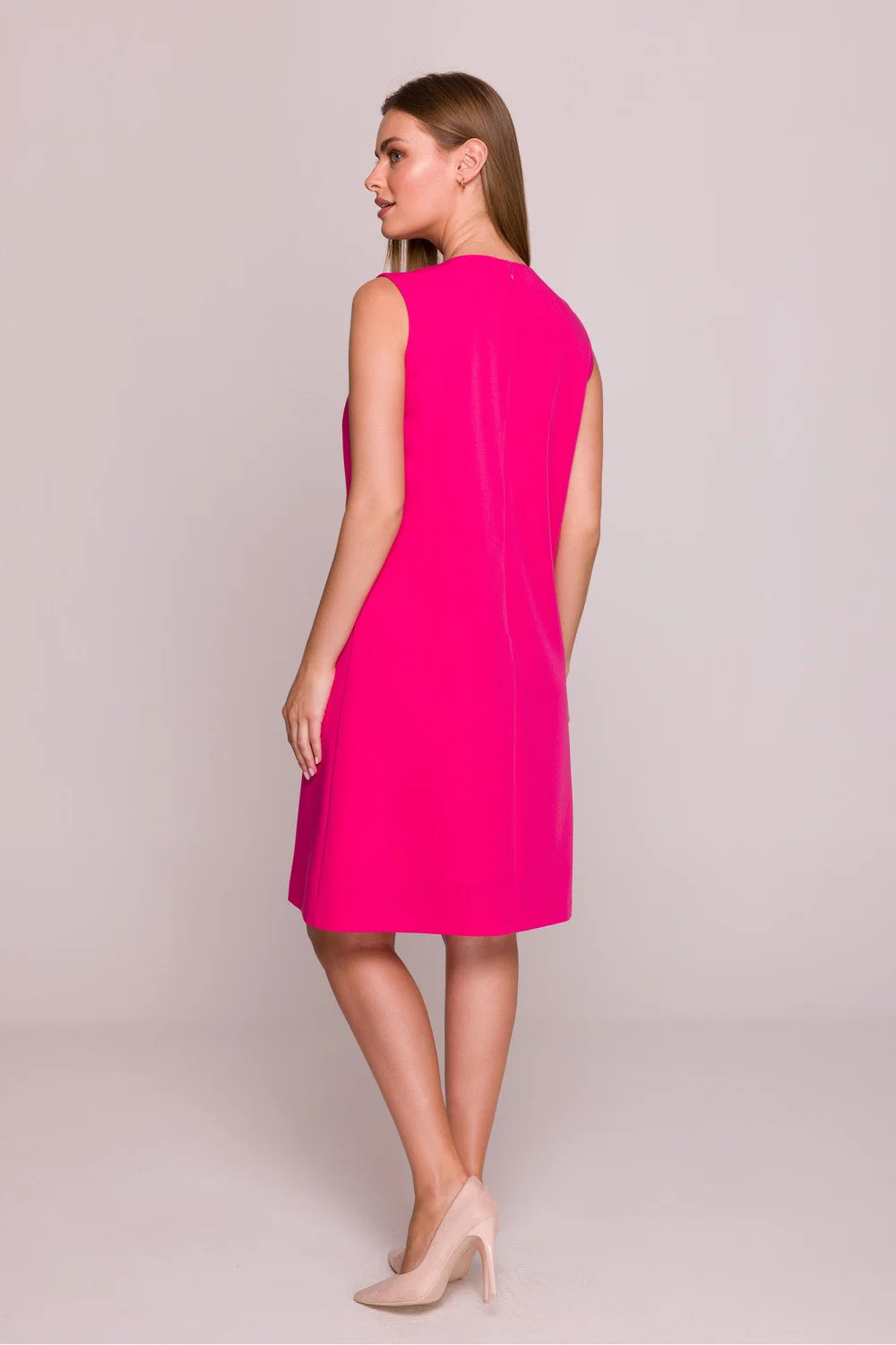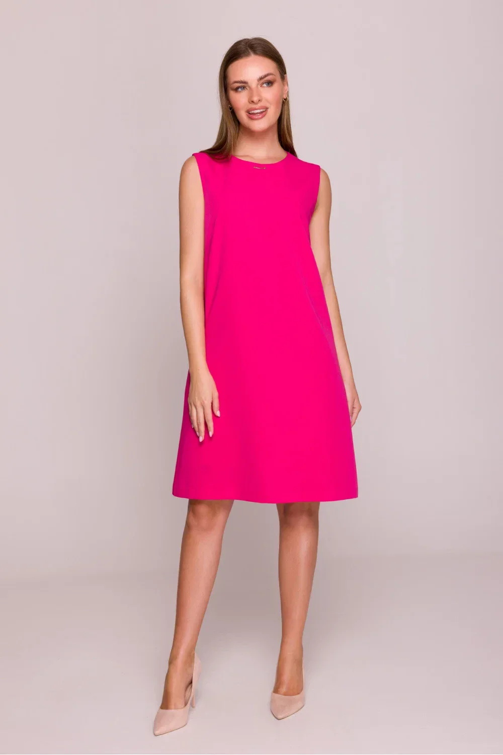 Elegantní šaty vyrobené z hladké, lehce elastické látky s lesklým saténovým povrchem, který jemně září a dodává celku jedinečný charakter. Model s kulatým výstřihem pod krkem zdobený kovovým detailom, který dodává subtilní eleganci. Šaty bez rukávů se zapínáním na skrytý zip na zádech, co zajišťuje pohodlné nošení a minimalistický vzhled. Střih je jednoduchý, trapezový, volný a neobepínající postavu, ideální na každý den a do kanceláře. Šaty mají podšívku, která zvyšuje pohodlí a trvanlivost oblečení. Délka před koleno zdůrazňuje ženskou siluetu a zároveň zajišťuje volnost pohybu. Navrženo a vyrobeno v Polsku.