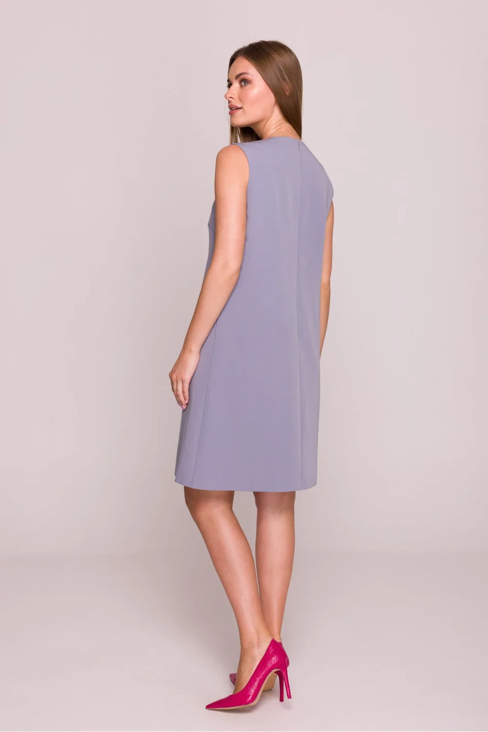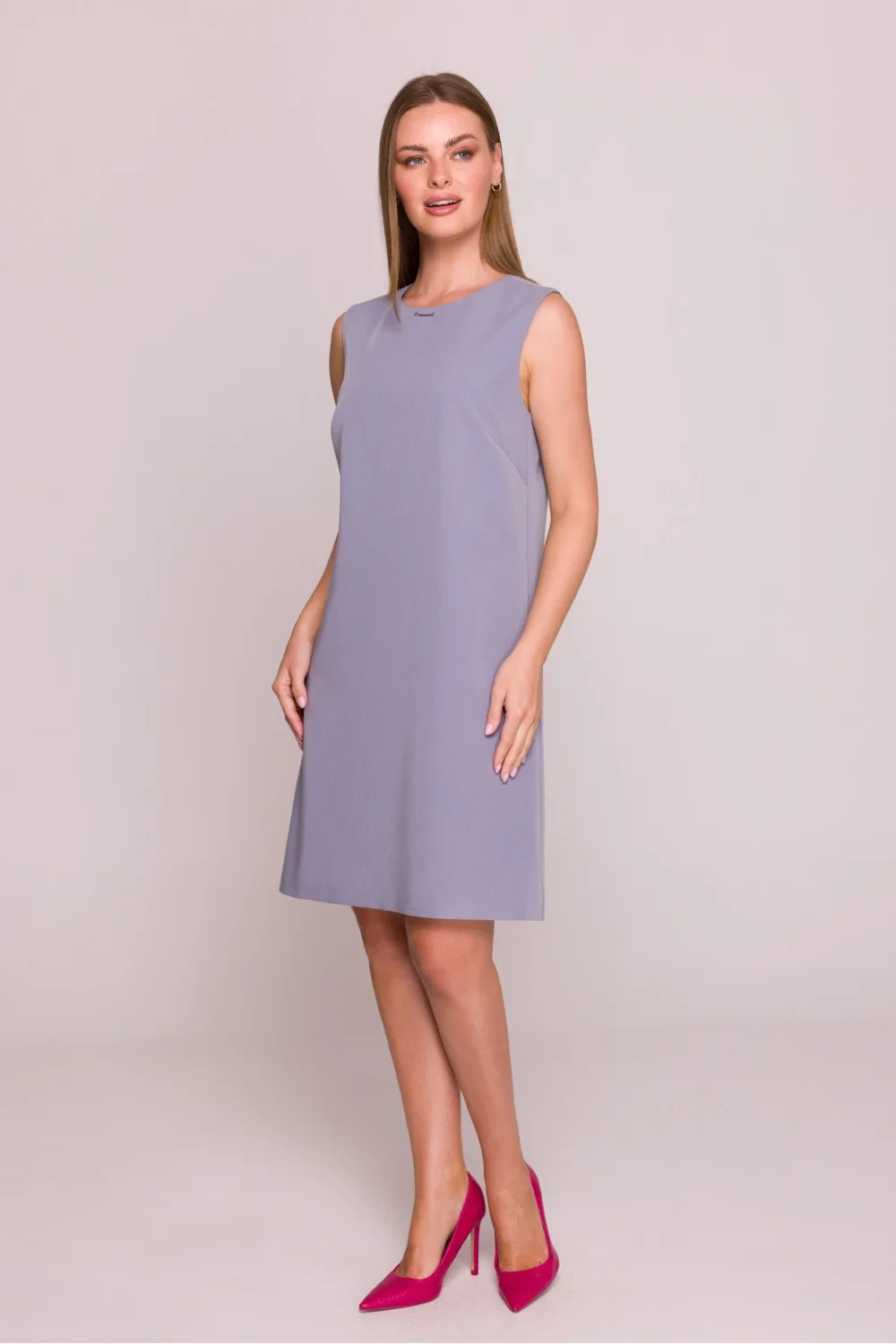 Elegantní šaty vyrobené z hladké, lehce elastické látky s saténovým povrchem, který jemně leskne a dodává celku výjimečný charakter. Model s kulatým výstřihem pod krkem zdobený kovovým prvkem, který přidává jemnou eleganci. Šaty bez rukávů, zapínající se na skrytý zip vzadu, což zajišťuje pohodlí nošení a minimalistický vzhled. Střih jednoduchý, trapézový, volný a nesedící na postavě, ideální na každý den a do kanceláře. Šaty mají podšívku, která zvyšuje pohodlí a trvanlivost oblečení. Délka před koleno zdůrazňuje ženskou siluetu a zároveň poskytuje volnost pohybu. Navrženo a ušito v Polsku.