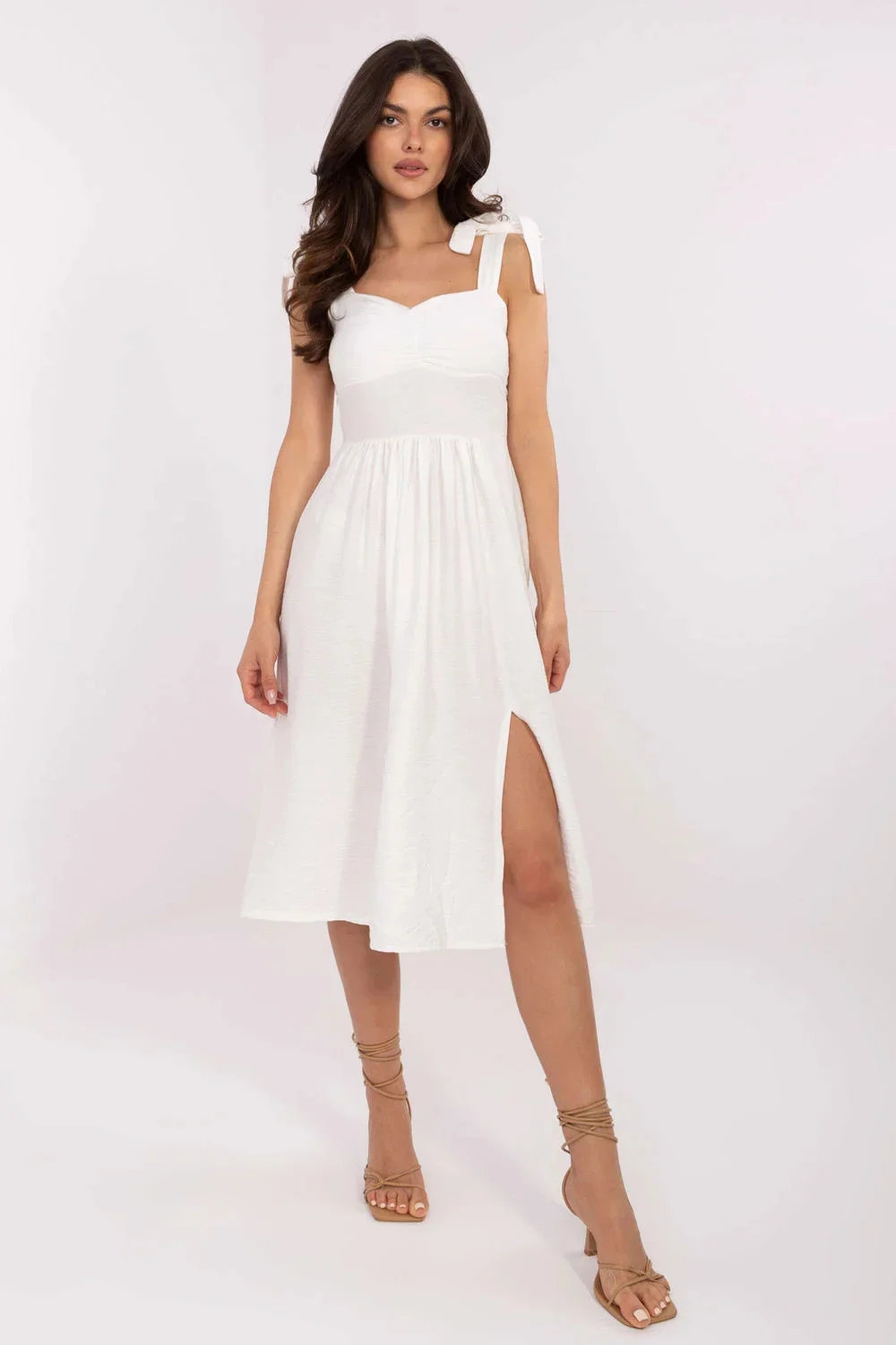 Lehké a dívčí toto letní šaty jsou ideálním návrhem na teplé každodenní dny. Vyrobené z prodyšné směsi viskózy a nylonu, poskytují pohodlí nošení a jemné ukládání materiálu. Mají rozkvetlý střih, který krásně zdůrazňuje pas a dodává postavě lehkost. Šňůrkovací ramínka umožňují regulaci délky a dekolt ve tvaru srdce s jemnými záhyby dodává celku romantického šarmu. Vzadu jsou šaty dokončeny elastickými záhyby s gumami, které se přizpůsobují postavě, zajišťují pohodlí a lepší přizpůsobení. Bez zapínání je tento model snadno obléknutelný. Délka pod koleno a hladký vzor činí šaty univerzálními a ideálními jak na procházky, nákupy, tak i letní setkání s přáteli.