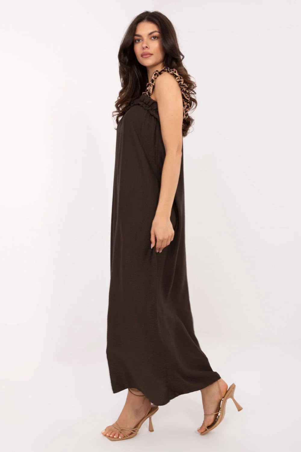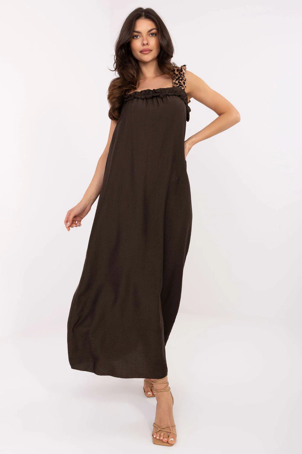 Letní maxi šaty na ramínka vyrobené z lehké, prodyšné viskózy jsou ideální volbou pro každodenní outfit v teplých dnech. Střih je lehce rozkročený, zdůrazňující ženskou siluetu a poskytující volnost pohybu. Šaty se vyznačují obdélníkovým výstřihem zdobeným decentním volánkem, který dodává celku romantický nádech. I když převládá hladký materiál, na ramínkách se objevuje módní akcent v podobě leopardího vzoru, který outfitu dodává trochu dravosti. Model nemá zapínání, nasazuje se přes hlavu, což zvyšuje pohodlí nošení. Ideální na procházky, nákupy nebo letní setkání s přáteli.