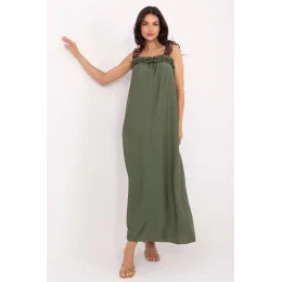 Letní maxi šaty na ramínka vyrobené z lehké, prodyšné viskózy jsou ideální volbou pro každodenní stylování v teplých dnech. Střih lehce rozkročený, který zdůrazňuje ženskou siluetu a zajišťuje volnost pohybu. Šaty se vyznačují obdélníkovým výstřihem zdobeným decentním volánem, který celému outfitu dodává romantický charakter. I když převažujícím vzorem je hladká látka, na ramínkách se objevuje módní akcent v podobě leopardího vzoru, který outfitu dodává trochu dravosti. Model nemá zapínání, obléká se přes hlavu, což zvyšuje pohodlí nošení. Ideální na procházky, nákupy nebo letní setkání s přáteli.