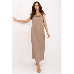 Letní maxi šaty na ramínka vyrobené z lehké, prodyšné viskózy jsou ideální volbou pro každodenní outfit v teplých dnech. Střih lehce rozšířený, zdůrazňující ženskou siluetu a poskytující volnost pohybu. Šaty se vyznačují obdélníkovým výstřihem zdobeným decentní volánkou, která celku dodává romantický charakter. I když hlavním vzorem je hladká látka, na ramínkách se objevuje módní akcent ve formě leopardího vzoru, který stylizaci dodává trochu divokosti. Model nemá zapínání a obléká se přes hlavu, což zvyšuje pohodlí nošení. Ideální na procházky, nákupy nebo letní setkání s přáteli.