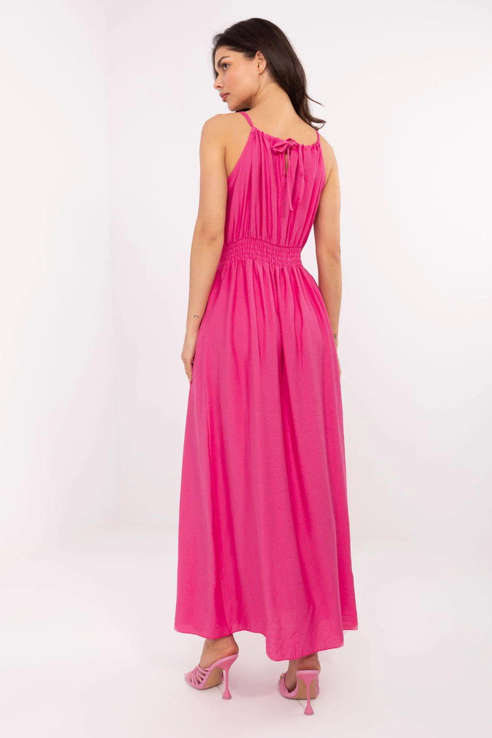 Letní maxi šaty s ramínky v kopertovém střihu jsou spojením pohodlí a decentní elegance na každý den. Vyrobené z lehkého, prodyšného materiálu směsi viskózy a nylonu, zajistí pohodlí nošení i v horkých dnech. Hladká látka zdůrazňuje univerzální charakter šatů, zatímco kulatý výstřih dodává jemnosti. Model nemá zapínání, obléká se přes hlavu s doplňkovým šněrováním na zádech, které nejen stabilizuje střih, ale také je zajímavým, ženským detail. Škrtání v pasu krásně formuje postavu, přidává lehkost a vzdušnost. Ideální na každodenní procházky, schůzky nebo letní výlety.