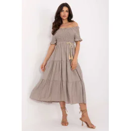 Letní midi šaty s rozšířeným střihem jsou skvělou volbou jak na každodenní nošení, tak na významné příležitosti. Vyrobené z lehké a prodyšné směsi viskózy a nylonu poskytují pohodlí nosit v teplých dnech. Hladká látka zdůrazňuje elegantní a zároveň decentní charakter šatů. Horní část s hispánským výstřihem s ruchy a elastickými gumičkami krásně zdůrazňuje ramena a dodává stylingu ženskosti. Krátké rukávy zakončené volánky přidávají lehkost a romantický půvab. Model nemá zapínání, nasazuje se přes hlavu. V pasu je pásek k zavázání, který umožňuje zdůraznit postavu a přizpůsobit šaty postavě. Ideální na procházky, letní večírky nebo setkání s blízkými.