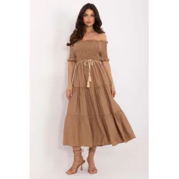 Letní midi šaty s rozšířeným střihem jsou skvělou volbou jak do každodenního nošení, tak na slavnostní příležitosti. Vyrobené z lehké a prodyšné směsi viskózy a nylonu poskytují pohodlí nosit v teplých dnech. Hladký materiál zdůrazňuje elegantní a zároveň decentní charakter šatů. Horní část s dekoltem typu španělská s ruchy a elastickými gumičkami krásně zdůrazňuje ramena a dodává stylizaci ženskosti. Krátké rukávy zakončené volány přidávají lehkost a romantický šarm. Model nemá zapínání, obléká se přes hlavu. V pasu je pásek k uvázání, který umožňuje zdůraznit siluetu a přizpůsobit šaty postavě. Ideální na procházky, letní večírky nebo setkání s blízkými.