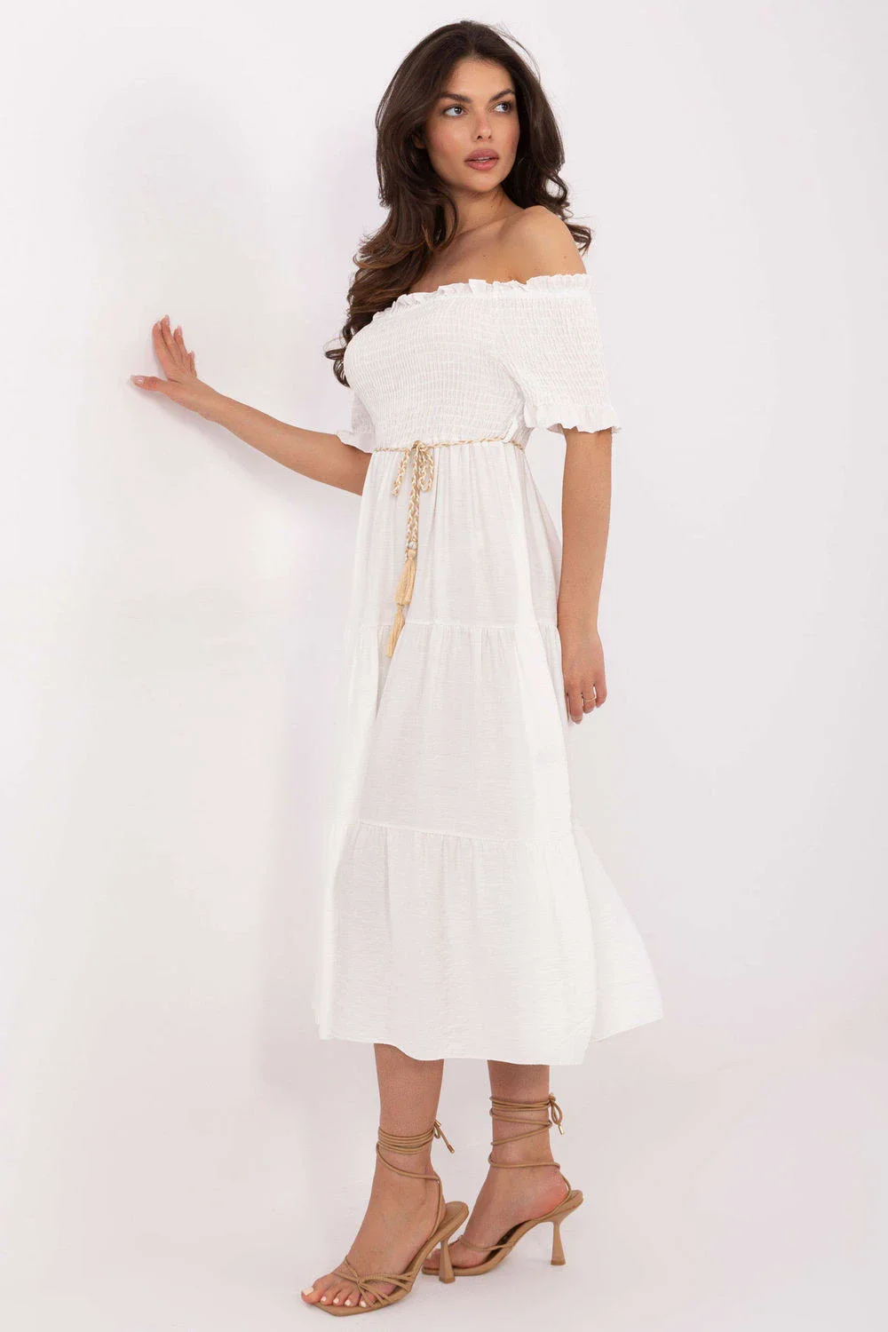 Letní midi šaty s rozšířeným střihem jsou skvělou volbou jak na každodenní nošení, tak na speciální příležitosti. Vyrobené z lehké a prodyšné směsi viskózy a nylonu poskytují pohodlí v teplých dnech. Hladká látka zdůrazňuje elegantní a zároveň decentní charakter šatů. Horní část je dokončena španělským výstřihem s ruchy a elastickými gumičkami, krásně zdůrazňuje ramena a dodává outfitu ženskost. Krátké rukávy s volány přidávají lehkosti a romantického šarmu. Model se nezavírá, nasazuje se přes hlavu. V pasu je pásek k zavázání, který umožňuje zdůraznit postavu a přizpůsobit šaty postavě. Ideální na procházky, letní večírky nebo setkání s blízkými.