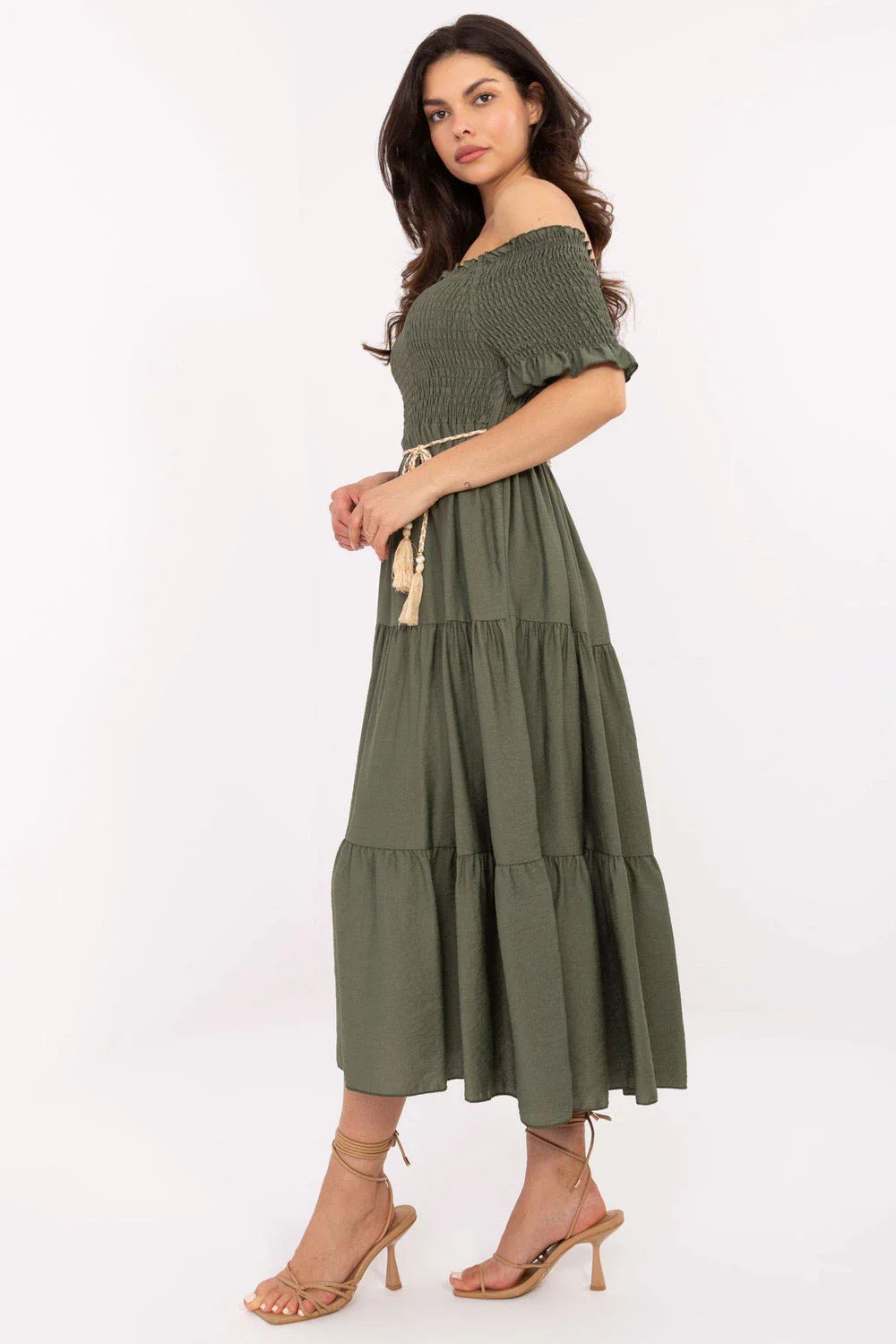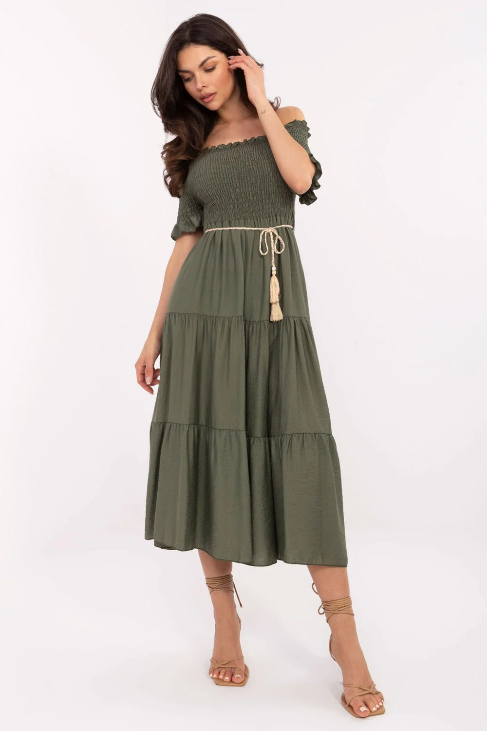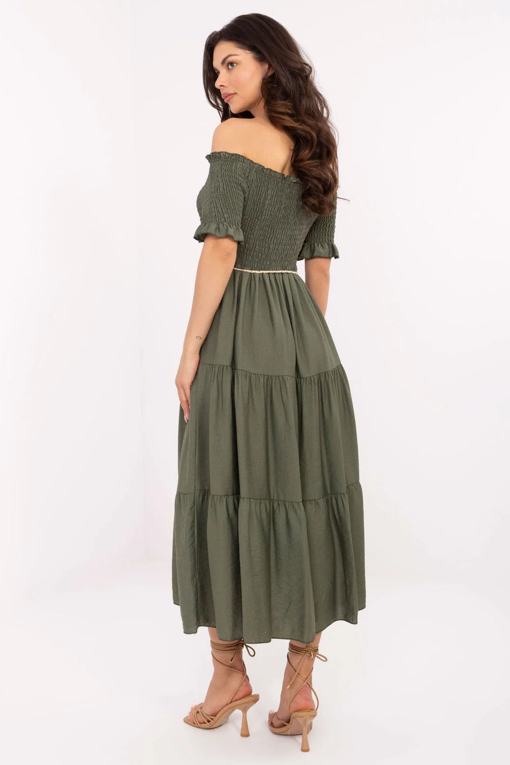 Letní midi šaty s rozšířeným střihem jsou skvělou volbou jak na každodenní nošení, tak na společenské události. Vyrobené z lehké a prodyšné směsi viskózy a nylonu, poskytují pohodlí v teplých dnech. Hladká tkanina zdůrazňuje elegantní a zároveň decentní charakter šatů. Horní část s hispánským výstřihem s ruffles a elastickými pásky nádherně zdůrazňuje ramena a dodává outfitu ženskosti. Krátké rukávy s volánky přidávají lehkost a romantický šarm. Model nemá zapínání, nasazuje se přes hlavu. V pase je šňůrka, která umožňuje zdůraznit siluetu a přizpůsobit šaty postavě. Ideální na procházky, letní večírky nebo setkání s blízkými.