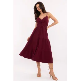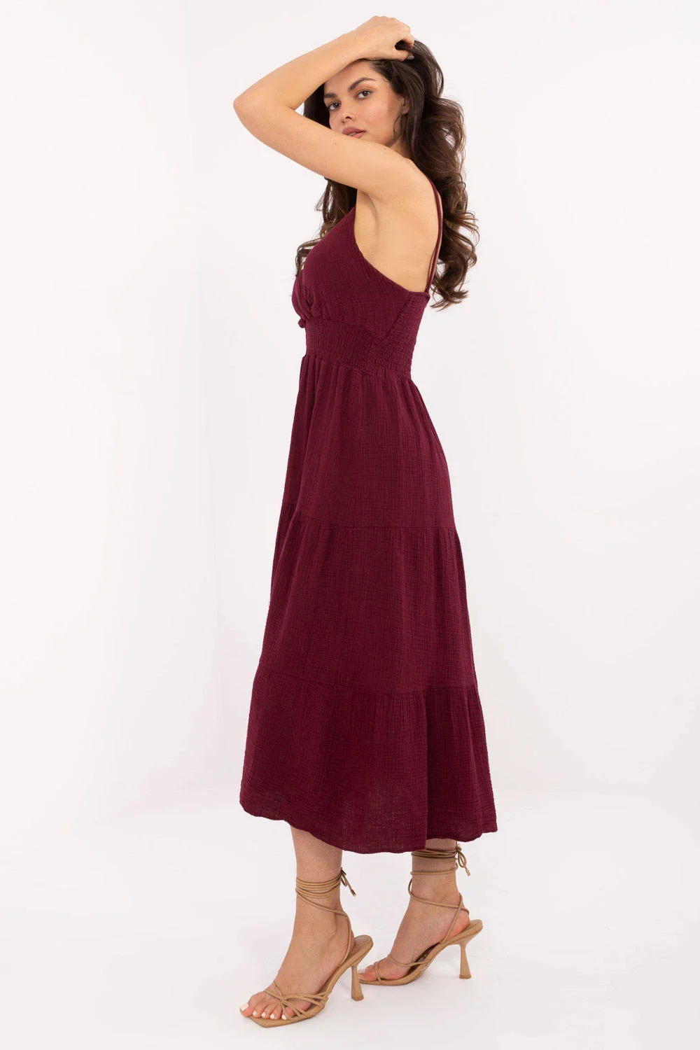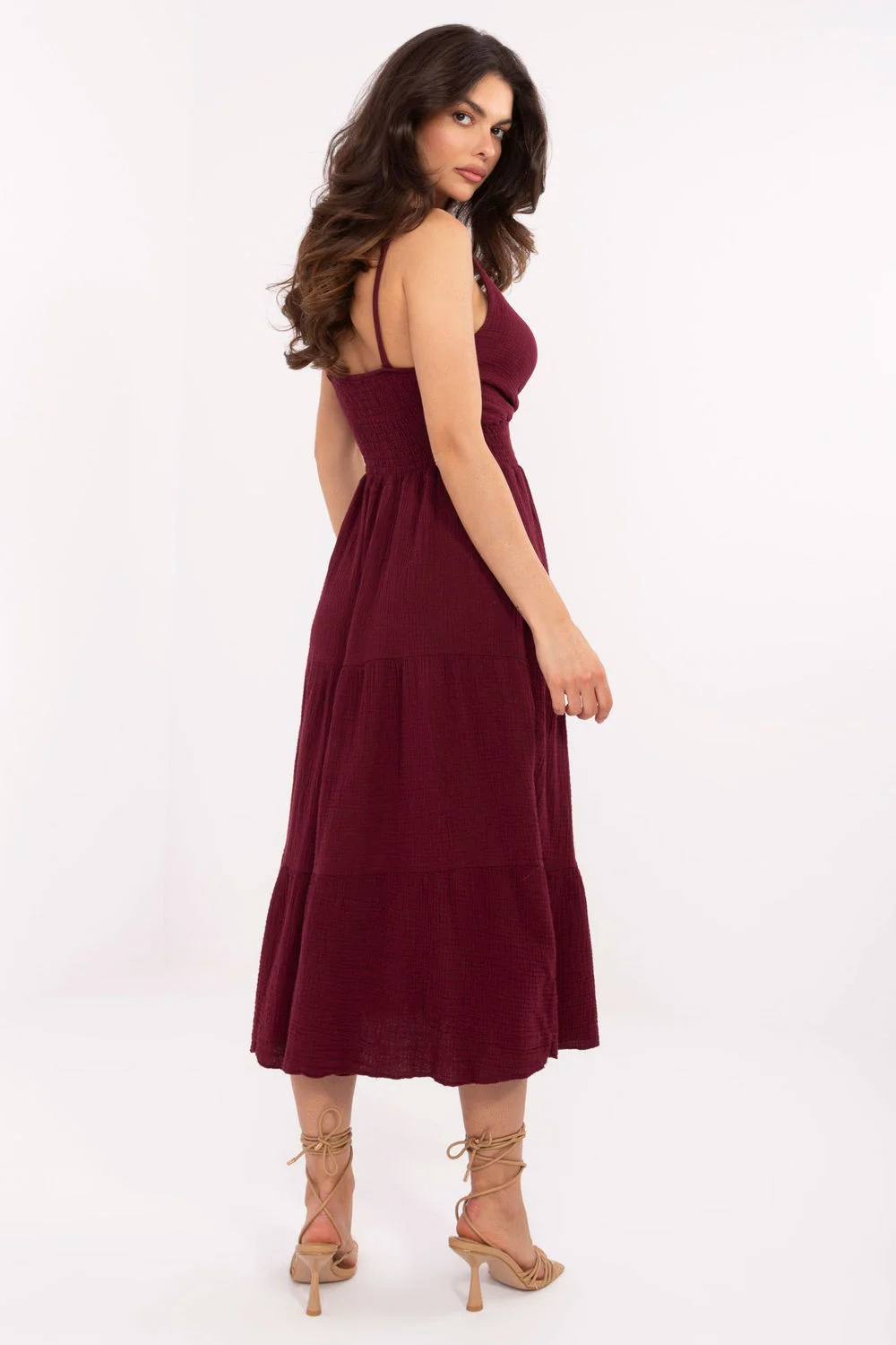Letní midi šaty z mušelínu na ramínka jsou ideální volbou pro každodenní pohodlné stylování. Vyrobené z měkké a prodyšné bavlny, skvěle se hodí na teplé dny, poskytují lehkost a pohodlí. Rozkročený střih krásně padne na postavě a hladká látka zdůrazňuje přirozený, minimalistický styl. Křížový výstřih jemně zdůrazňuje dekolt a přidává ženský šarm. Šaty nemají zapínání, oblékají se přes hlavu a elastické rouchu pod prsy a na zádech zajistí ideální přizpůsobení postavě. Dodatečná volánka dole dodává šatům romantický, dívčí charakter. Skvělé na procházku, setkání s přáteli nebo letní den ve městě.