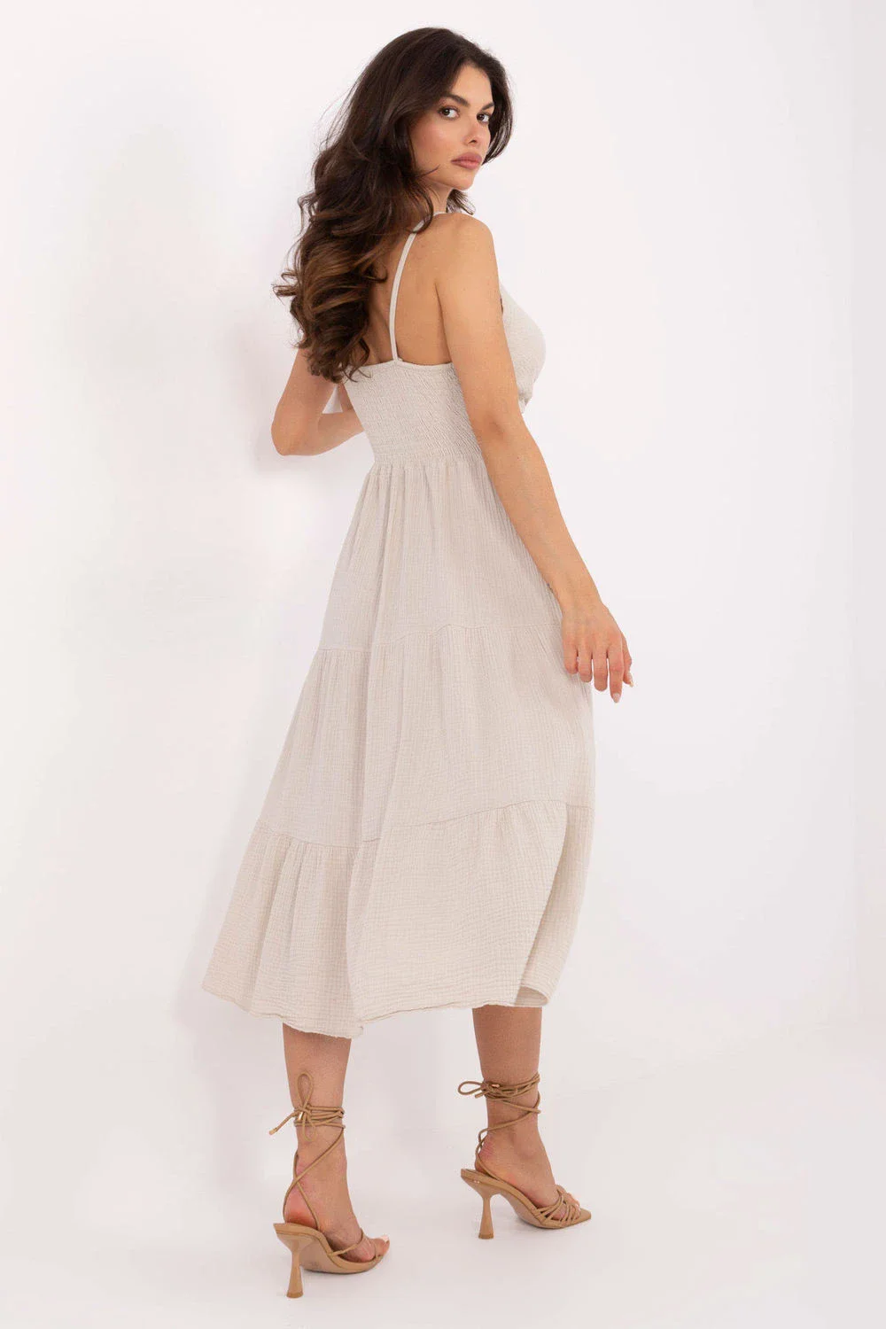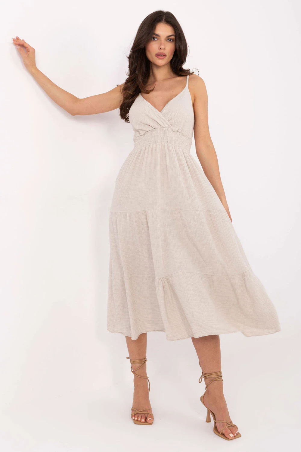 Letní mušelínové midi šaty na ramínka jsou ideální volbou pro každodenní pohodlný styl. Vyrobené z měkké a prodyšné bavlny, skvěle se hodí na teplé dny, poskytují lehkost a pohodlí. Rozšířený střih se krásně skládá na postavě, hladká látka zdůrazňuje přirozený, minimalistický styl. Záhyb na dekoltu jemně zdůrazňuje výstřih a dodává ženský půvab. Šaty nemají zapínání, oblékají se přes hlavu a elastické rouchování s gumičkami pod prsy a na zádech zajišťuje ideální přizpůsobení postavě. Další volánek dole dodává šatům romantický, dívčí charakter. Skvělé na procházku, setkání s přáteli nebo letní den ve městě.