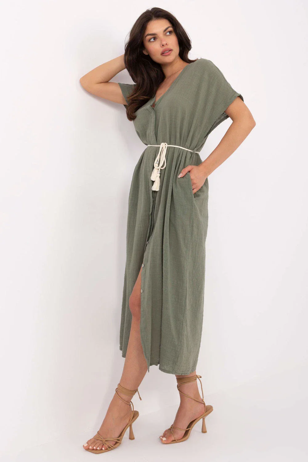 Letní košilové šaty v boho stylu jsou pohodlným a stylovým návrhem na každý den. Vyrobené z přírodní, prodyšné bavlny, poskytují pohodlí nošení i v nejteplejší dny. Oversize střih zaručuje volnost pohybů a volné, nezávazné přizpůsobení, hladká látka dodává šatům univerzální charakter. Model s midi délkou, krátkým rukávem a výstřihem do V vypadá lehce a žensky. Zapínání na knoflíky skryté pod lištou dodává celku elegantní dokončení. Další výhodou jsou kapsy a pásek k zavázání s ozdobnými řasami, který umožňuje zdůraznit pas a přidat stylizaci boho charakteru. Ideální na letní dny, pohodlné, stylové a praktické.