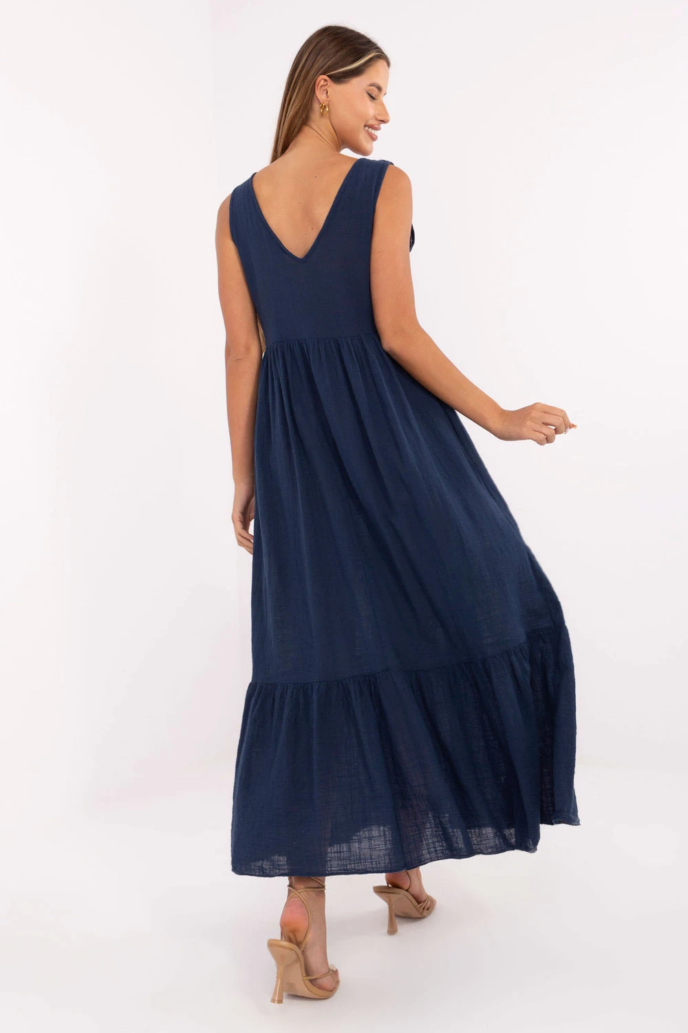 Dlouhé letní šaty s rozšířeným střihem jsou ideální nabídkou pro každodenní teplé dny. Vyrobené z přírodní bavlny poskytují prodyšnost a pohodlí nošení i v největším horku. Model s širokými ramínky a výstřihem do srdíčka decentně zdůrazňuje horní část postavy, zatímco volně padající spod s obratkou přidává lehkost a ženský šarm. Šaty nemají zip, co usnadňuje jejich oblékání a zajišťuje pohodlí po celý den. Hladký vzor je univerzální a snadno se stylizuje, a praktické kapsy v bocích dodávají funkčnost. Je to must-have v letním šatníku, ideální na procházky, nákupy nebo setkání venku.