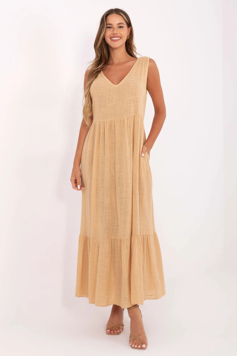 Dlouhé letní šaty s rozkročeným střihem jsou ideální volbou pro každodenní teplé dny. Vyrobené z přírodní bavlny, zajistí prodyšnost a pohodlí i v největším horku. Model s širokými ramínky a výstřihem do šípku jemně zdůrazňuje horní část postavy, zatímco volně padající spodní část zakončená volánem dodává lehkost a ženský šarm. Šaty nemají zapínání, což usnadňuje jejich oblékání a zaručuje pohodlí po celý den. Hladký vzor je univerzální a snadno se stylizuje, a praktické kapsy ve švech na bocích dodávají funkčnost. Jsou must-have v letní šatníku, ideální na procházky, nákupy nebo setkání venku.