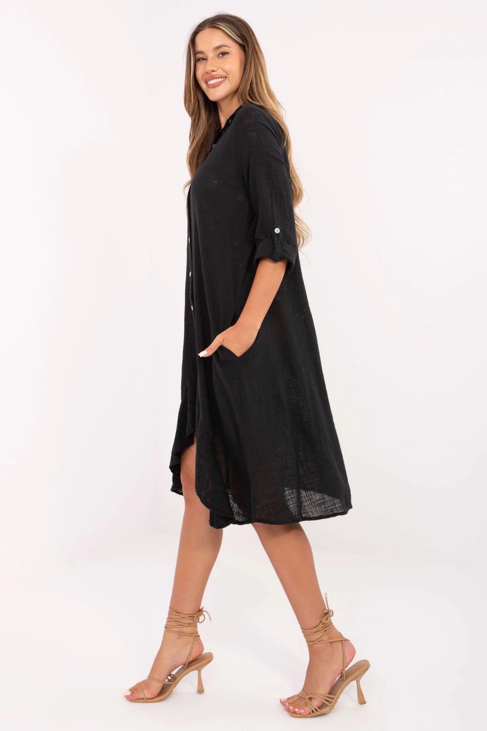 Letní košilové šaty s asymetrickým střihem jsou stylovým a pohodlným návrhem na každý den. Vyrobené z lehké, prodyšné bavlny poskytují pohodlí i v teplejších dnech. Model je vyznačen asymetrickým předním dílem a volánem na spodní části s jemným vyšívaním, které celku dodává jemný ženský akcent. Délka pod kolena a volnější střih zajišťují, že šaty vypadají uvolněně, ale zároveň elegantně. Zapínání na knoflíky, s klasickým límcem a 3/4 rukávy s možností zavinutí, umožňuje snadné přizpůsobení stylizaci a počasí. Další výhodou jsou praktické kapsy skryté v bočních švech. Ideální na každodenní vycházky, spojují funkčnost s moderním vzhledem.