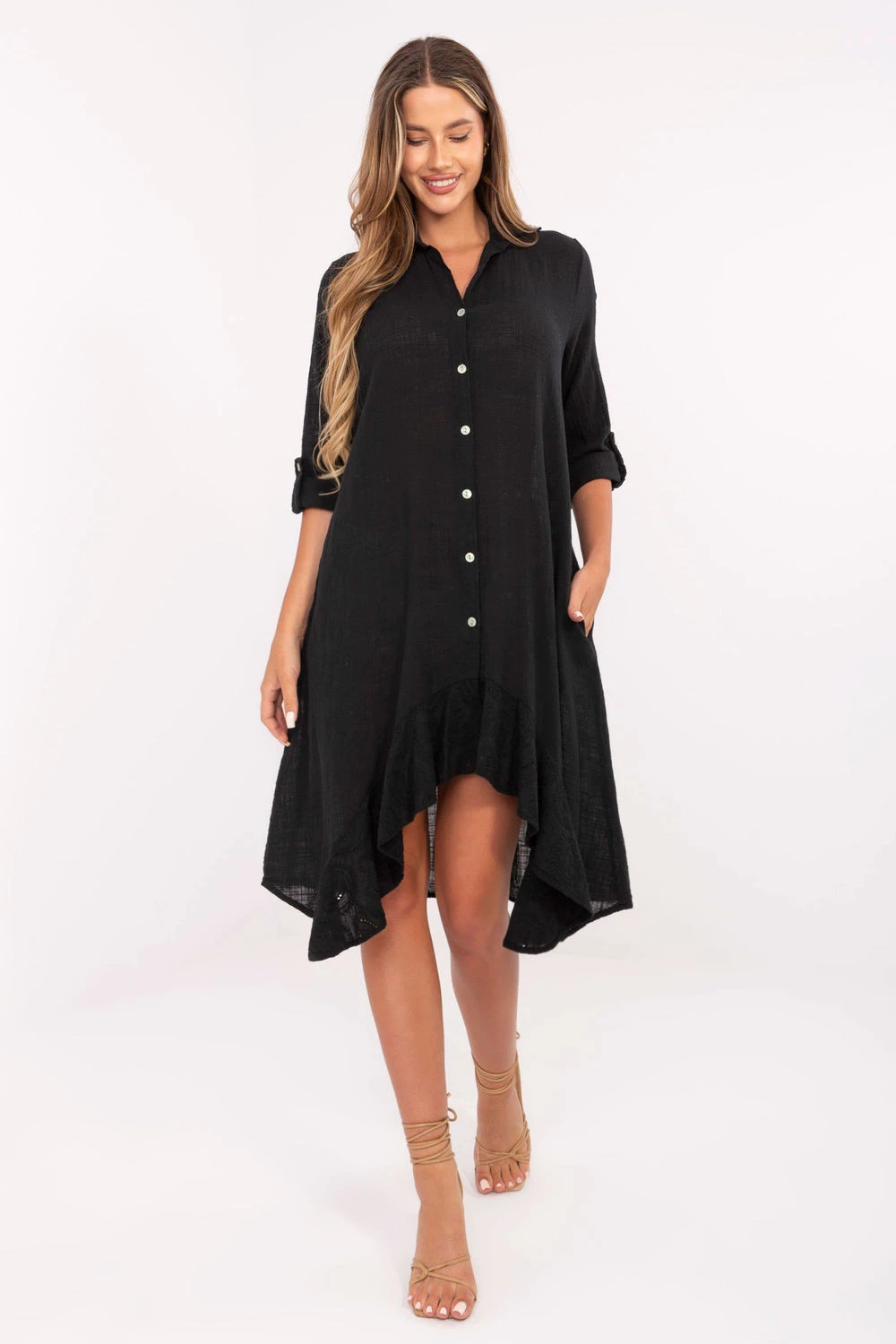 Letní košilové šaty s asymetrickým střihem jsou stylovým a pohodlným návrhem na každý den. Vyrobené z lehké, prodyšné bavlny poskytují pohodlí i v teplejších dnech. Model je vyznačen asymetrickým předním dílem a volánem na spodní části s jemným vyšívaním, které celku dodává jemný ženský akcent. Délka pod kolena a volnější střih zajišťují, že šaty vypadají uvolněně, ale zároveň elegantně. Zapínání na knoflíky, s klasickým límcem a 3/4 rukávy s možností zavinutí, umožňuje snadné přizpůsobení stylizaci a počasí. Další výhodou jsou praktické kapsy skryté v bočních švech. Ideální na každodenní vycházky, spojují funkčnost s moderním vzhledem. Bavlna 100 %
