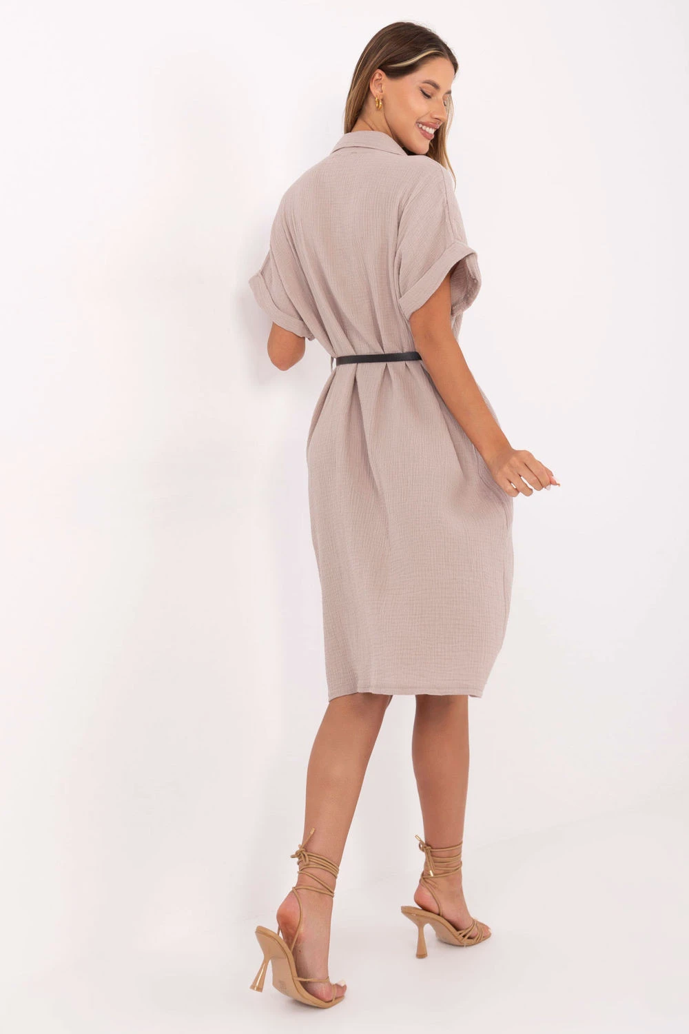 Klasické mušelínové šaty s jednoduchým střihem jsou ideální volbou na každý den i do práce. Vyrobené z prodyšné 100% bavlny zajišťují pohodlné nošení po celý den, i v teplejších dnech. Hladká látka a decentní design dělají z těchto šatů skvělý kousek do minimalistického a zároveň elegantního stylu. Model s krátkým rukávem, klasickým límečkem a zapínáním na knoflíky po celé délce. V pasu je opasek, který zdůrazňuje postavu a umožňuje upravit střih podle vlastních preferencí. Délka za koleno z nich činí univerzální volbu do kanceláře, na schůzky nebo každodenní vycházky. Jedná se o nadčasovou nabídku pro ženy, které ocení jednoduchost, pohodlí a přírodní materiály v stylovém provedení.