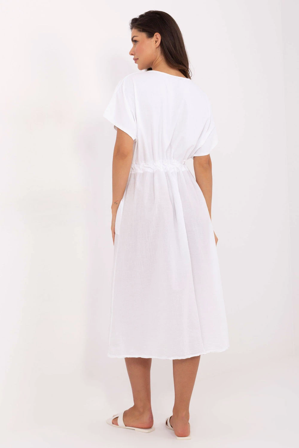 Vzdušné a pohodlné letní šaty s rozšířeným střihem, vyrobené z přírodní bavlny. Hladká látka zajišťuje pohodlí nošení a skvěle se hodí do každodenního stylu. Model midi délky s krátkým rukávem a klasickým kulatým výstřihem. V pase je šňůrka, která podtrhuje siluetu a umožňuje přizpůsobit šaty postavě. Další výhodou jsou praktické kapsy, které dodávají funkčnost a volnost. Ideální volba na letní procházky, nákupy, do práce nebo setkání s přáteli. Univerzální a nadčasová, bude skvělým základem pro mnoho stylizací.