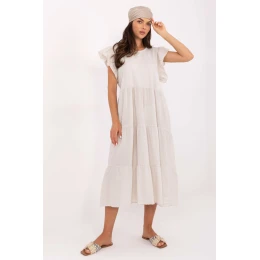 Volný, pohodlný a stylový, tento oversized bavlněný šaty jsou ideální volbou pro každodenní letní outfit. Vyrobený z přírodní, prodyšné látky, poskytuje volnost pohybu a pohodlí po celý den. Model midi délky z hladkého materiálu s kulatým výstřihem a krátkým rukávem zakončeným jemným volánem, který přidává ženský akcent. Zadní část šatů zdobí decentní šněrování na zádech, které dodává celku lehce romantický charakter. Šaty se skvěle hodí na každodenní nošení do práce, na nákupy, procházku nebo setkání s přáteli. Stylové v jejich jednoduchosti, budou skvělým základem pro mnoho letních outfitů.