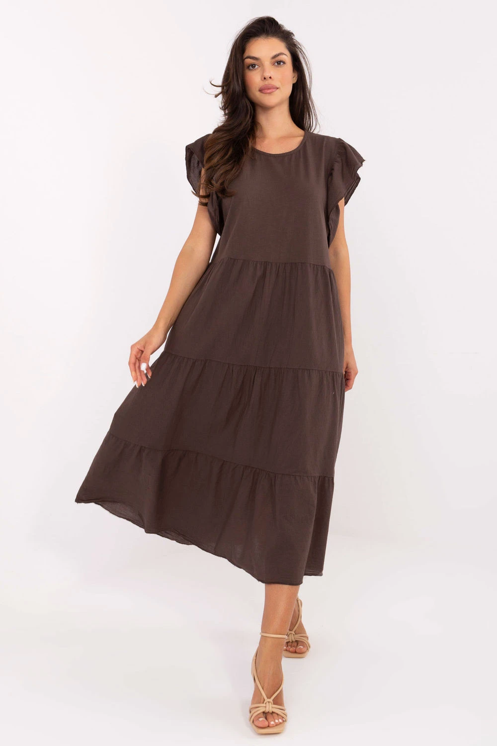 Volný, pohodlný a stylový, tento oversized bavlněný šaty jsou ideální volbou pro každodenní letní outfit. Vyrobený z přírodní, prodyšné látky, poskytuje volnost pohybu a pohodlí po celý den. Model midi délky z hladké látky, s kulatým výstřihem a krátkým rukávem zakončeným jemným volánem, který přidává ženský dotek. Zadní část šatů zdobí decentní šněrování na zádech, které dává celému outfitu lehce romantický charakter. Šaty se skvěle hodí na každodenní nošení do práce, na nákupy, procházku nebo setkání s přáteli. Stylové ve své jednoduchosti, budou skvělým základem pro mnoho letních outfitů.