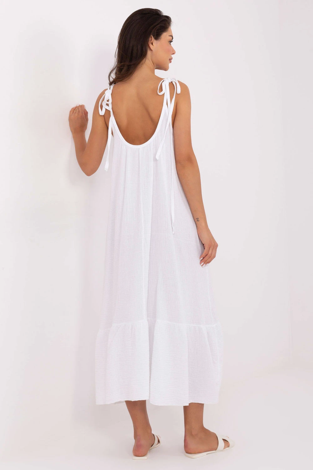 Lehké, prodyšné a neuvěřitelně pohodlné šaty vyrobené z jemné bavlněné muselínu ideální na teplé letní dny. Hladký materiál a rozkročený střih vytvářejí stylový, ale zároveň volný návrh na každý den. Model s midi délkou, s kulatým výstřihem a vázanými ramínky, které umožňují úpravu a přizpůsobení siluetě. Spodek šatů je dokončen efektní volánkou, která celku dodává lehkost a dívčí půvab. Jedná se o skvělou volbu na každodenní vycházky, procházky, dovolenou nebo setkání s přáteli. Přírodní tkanina a volný střih zajistí plný komfort i v největším horku. Délka šatů je udávána bez ramínek.