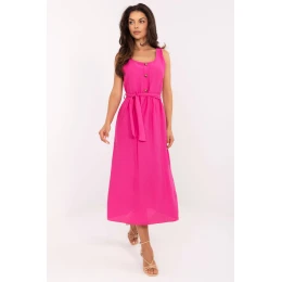 Letní šaty s rozkročeným střihem jsou skvělou volbou na každodenní výlety v teplých dnech. Vyrobené z prodyšné a příjemné směsi viskózy a nylonu, poskytují pohodlí nošení a lehkost střihu. Model bez rukávů s klasickým kulatým výstřihem krásně zdůrazňuje ramena a midi délka dělá šaty univerzální a vhodné na mnoho příležitostí. Hladká látka podtrhuje jemný charakter stylizace a ozdobné knoflíky vpředu dodávají šatičkám jemný šarm a trochu vintage stylu. V pasu je pásek k zavázání, který umožňuje přizpůsobit šaty siluetě a zdůraznit ženskou postavu. To je ideální návrh na léto pohodlný, stylový a plný elegance.