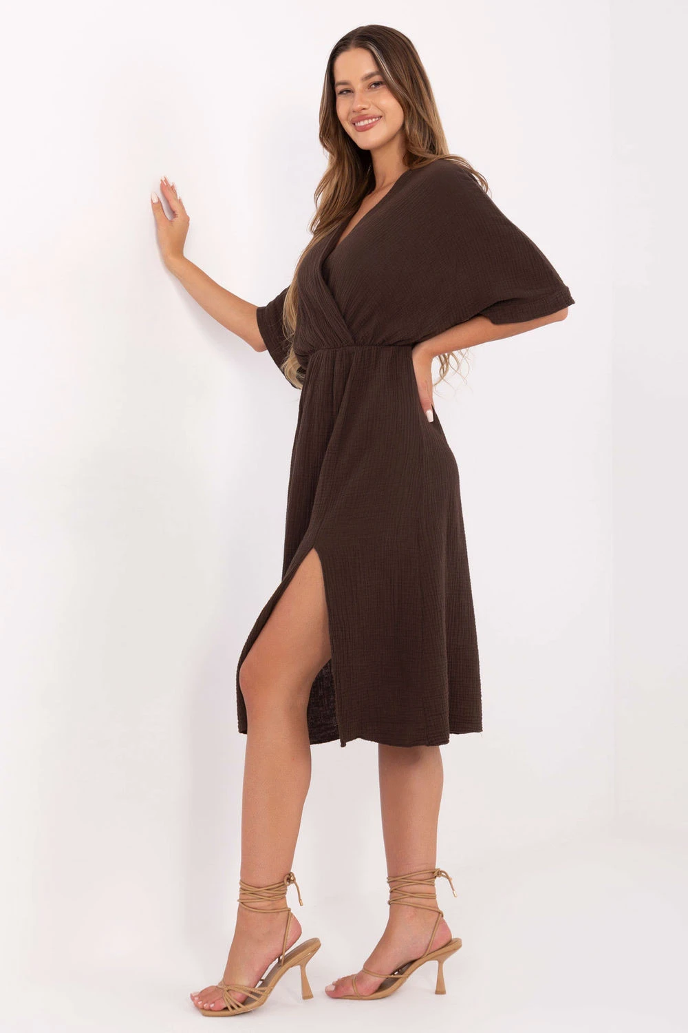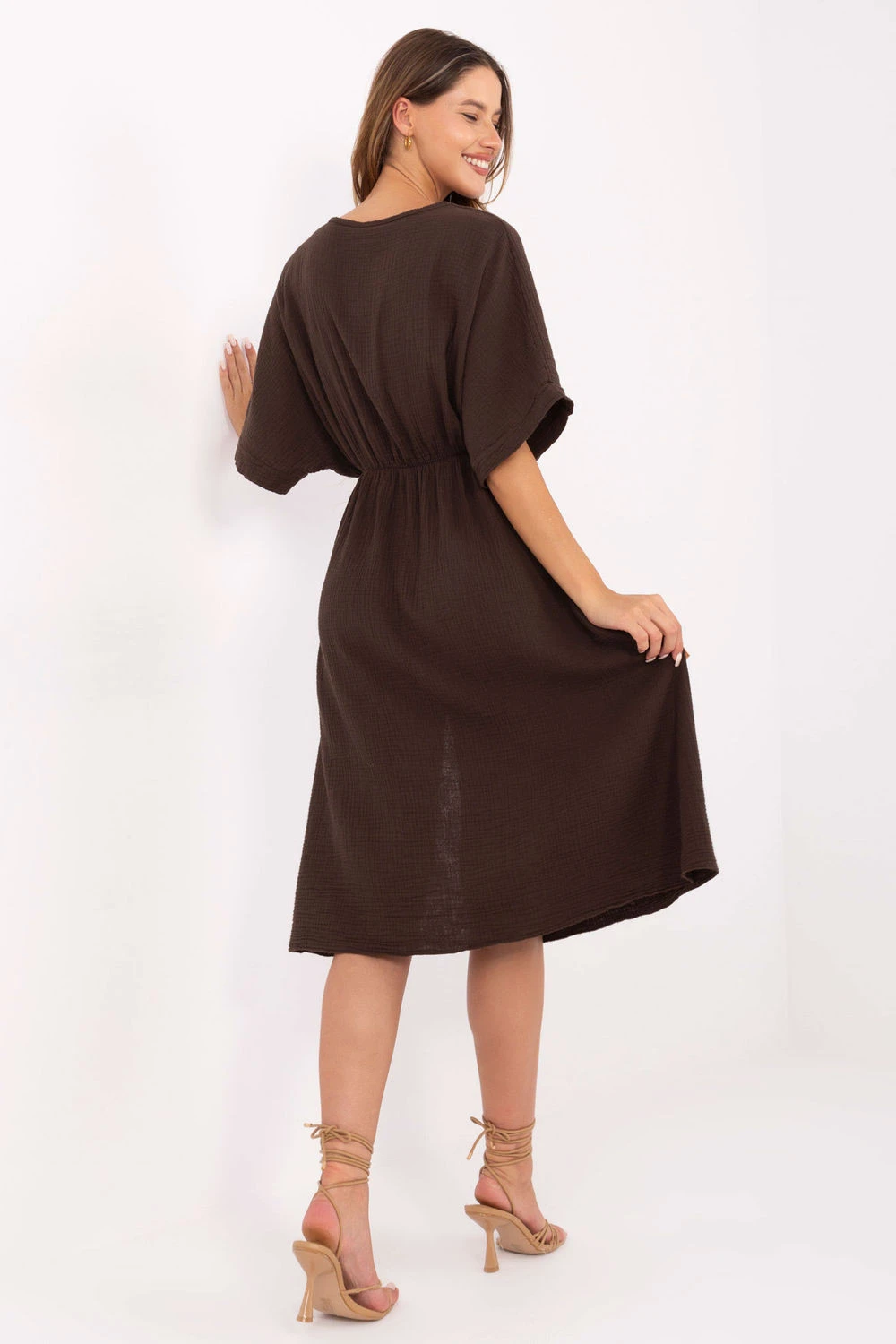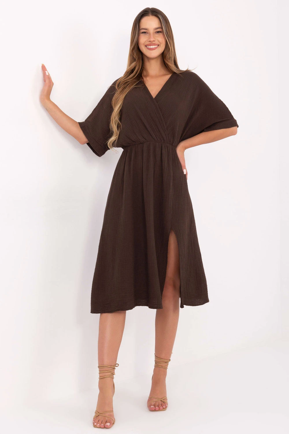 Letní šaty z prodyšného mušelínu jsou must-have v každodenní garderobě. Vyrobena z 100% bavlny, poskytuje výjimečný komfort a prodyšnost i v horkých dnech. Rozkročený střih s překrytým předním dílem krásně zdůrazňuje postavu, a elastický pásek v pasu zajistí ideální přizpůsobení bez nutnosti zapínání. Hladká tkanina, midi délka a krátký rukáv dělají tyto šaty univerzálními, skvělé jak na procházku, tak na volné setkání. Přírodní lehkost, pohodlí a nadčasový styl.