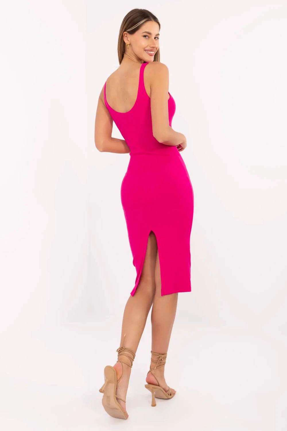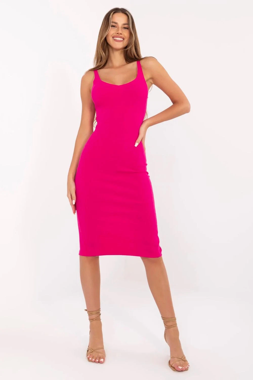 Pruhované úzké šaty s ramínky jsou ideální volbou na každý den i do práce. Vyrobena z elastického materiálu z kombinace bavlny a elastanu, skvěle se přizpůsobuje postavě, zdůrazňuje ženské tvary a zároveň poskytuje pohodlí při nošení. Hladká faktura pruhované látky v kombinaci s klasickým střihem midi dodává šatům eleganci v casual stylu. Výstřih do tvaru srdce jemně zdůrazňuje dekolt a dodává lehkost celému outfitu. Tenké ramínka a přiléhavý střih zaručují, že se tento model skvěle hodí jak do kanceláře (ve dvojici s sakem), tak i na každodenní vycházky. Jedná se o nadčasový kousek šatníku, který spojuje jednoduchost, pohodlí a ženský styl.